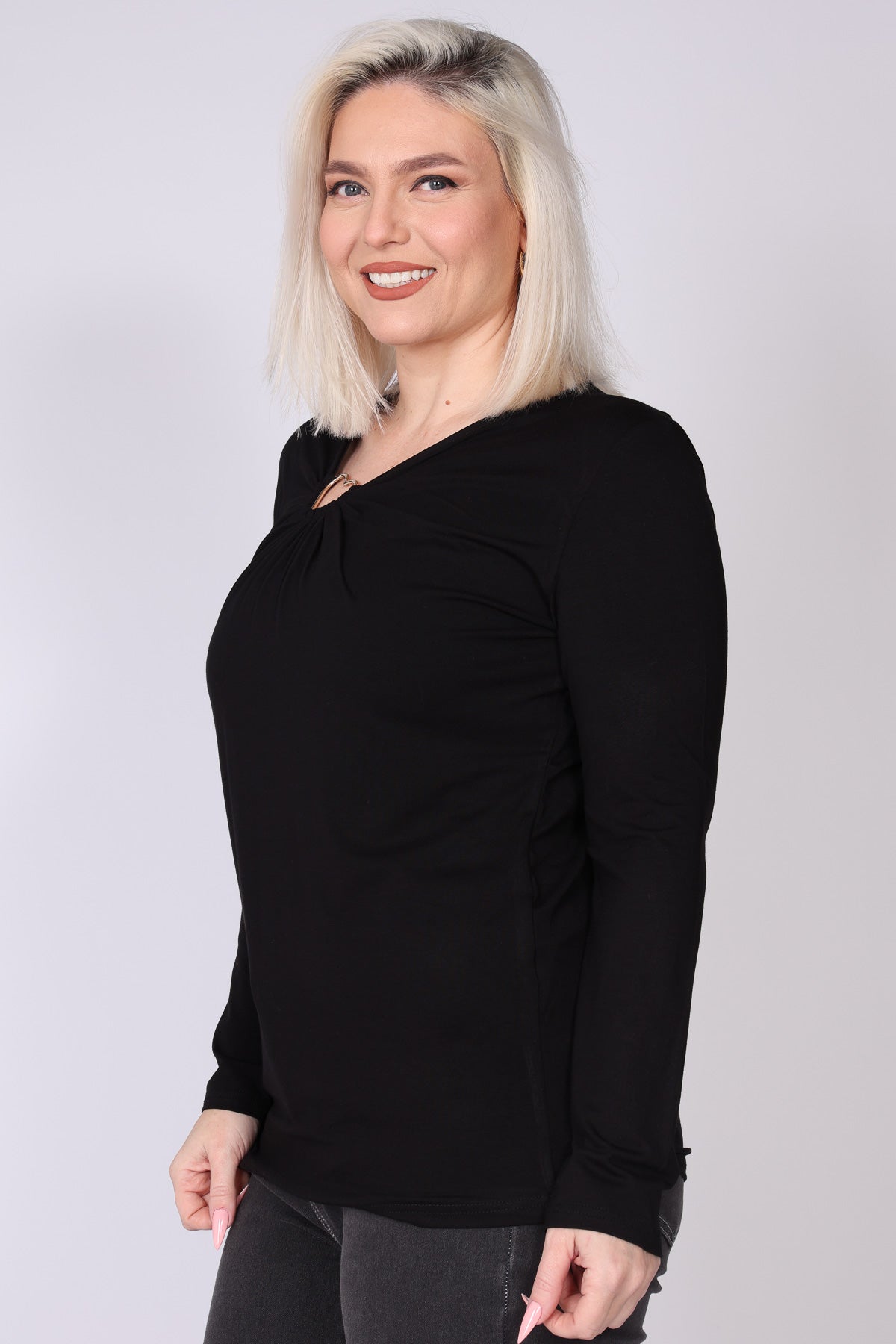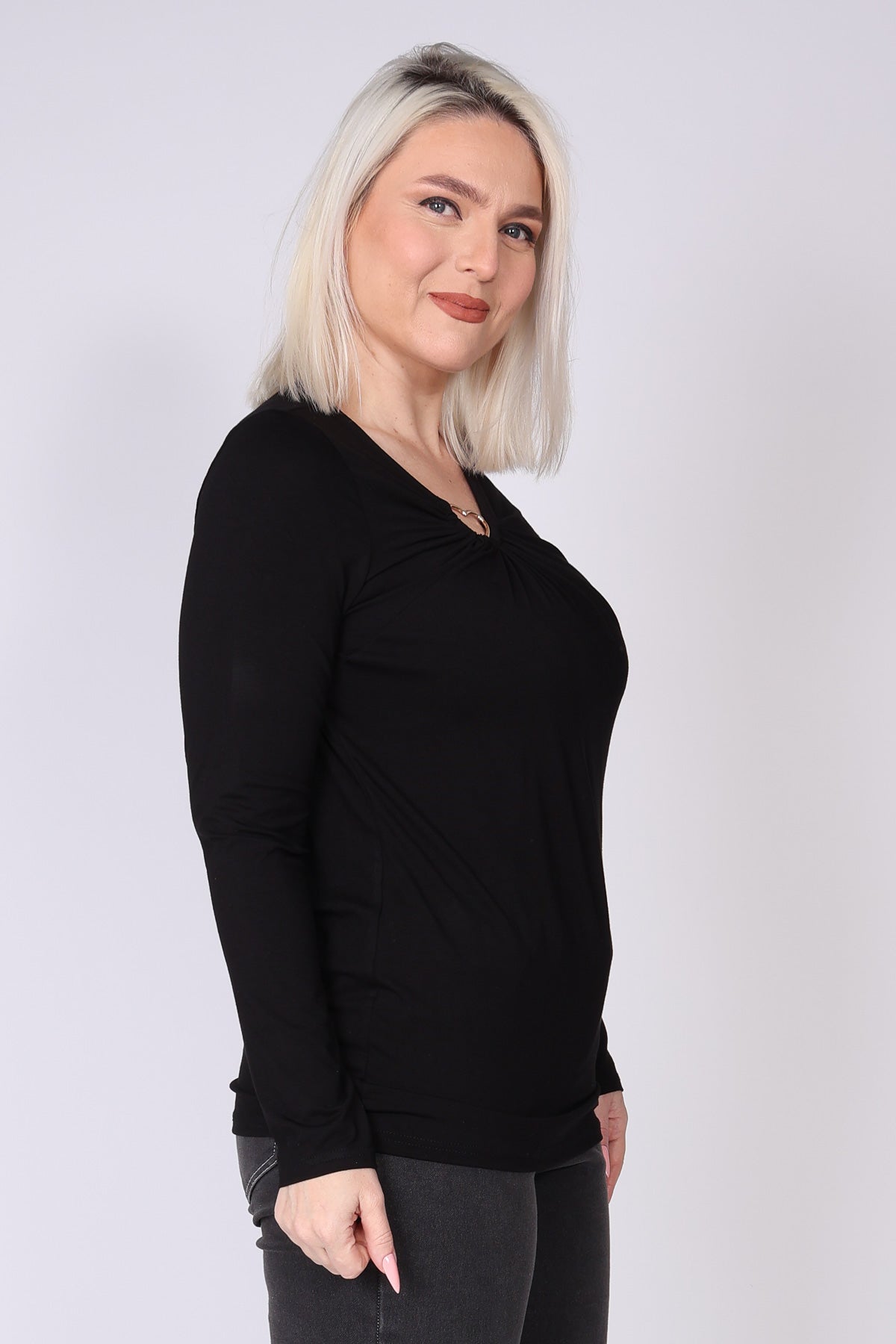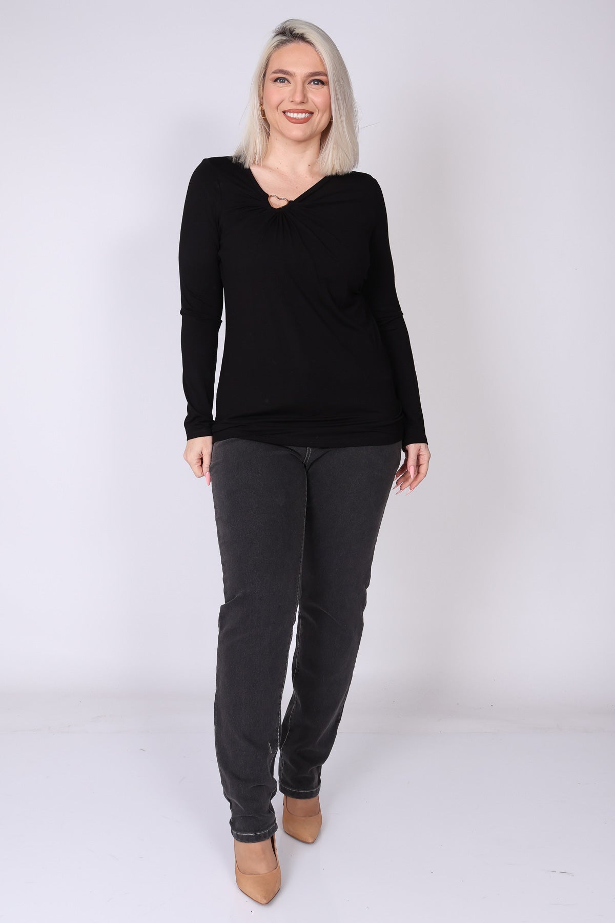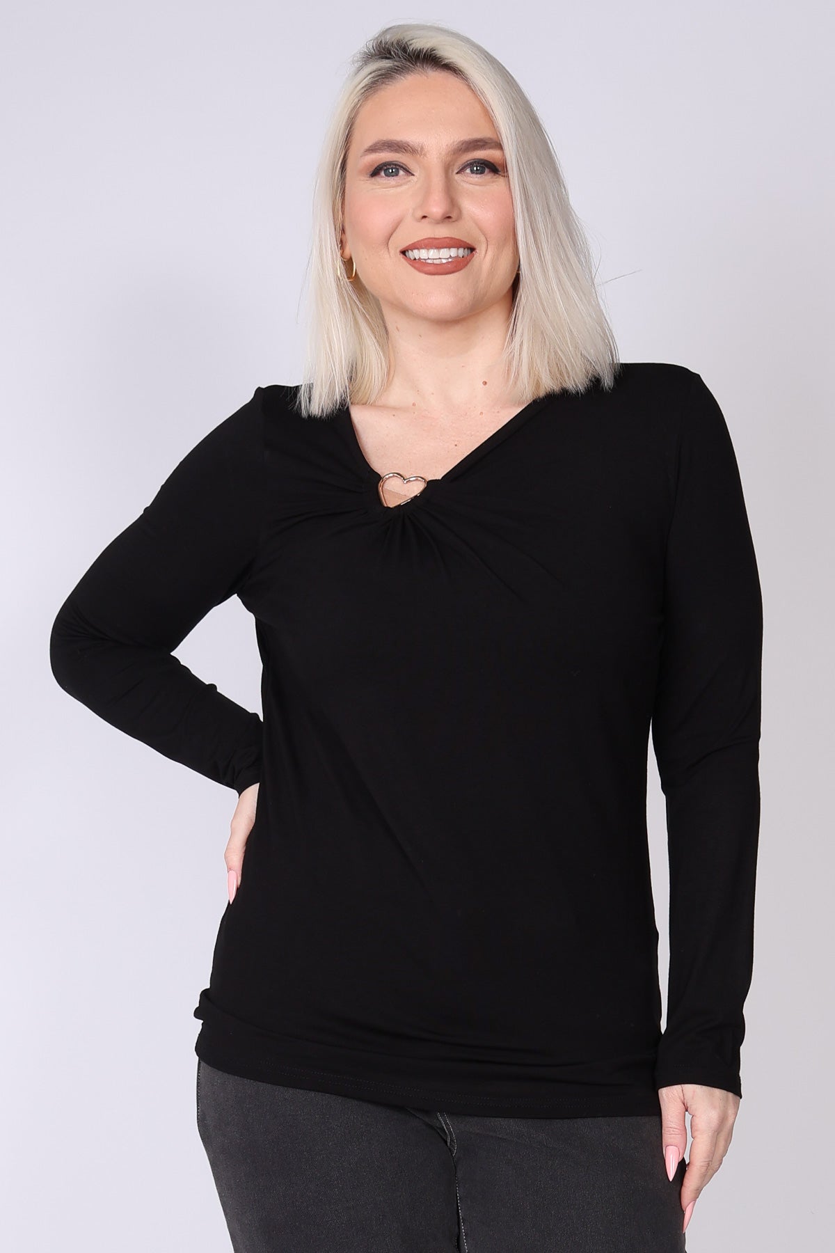 חולצה קלאסית בגזרה ישרה עם שרוולים ארוכים ומפתח צוואר בצורת V, המעוטר באבזם עדין בצורת לב. העיצוב הנקי מקבל טוויסט נשי ומדויק, שמוסיף עניין מבלי להעמיס. הבד רך, גמיש ונעים למגע, ומתאים ללבישה יומיומית לאורך כל היום.