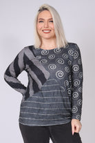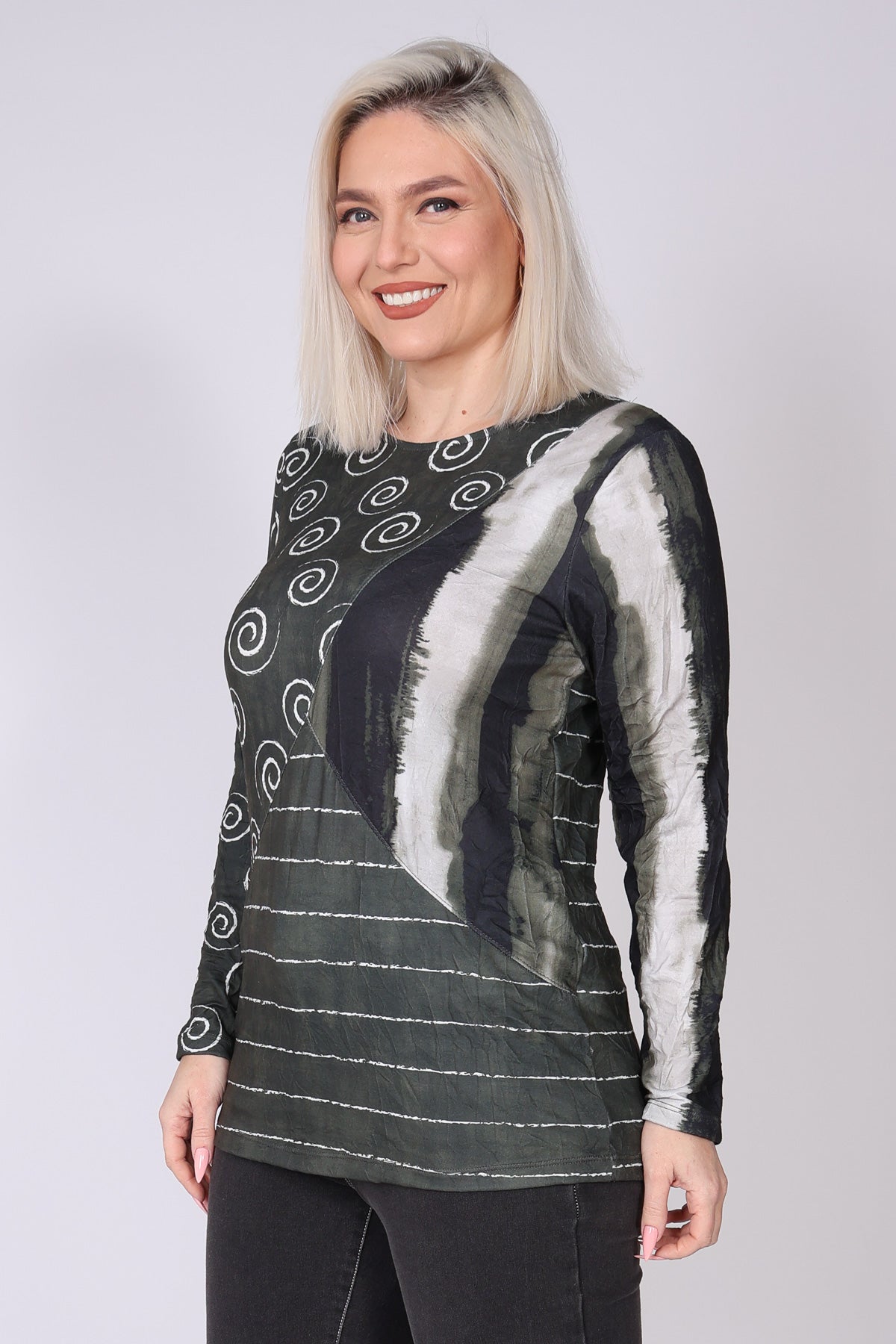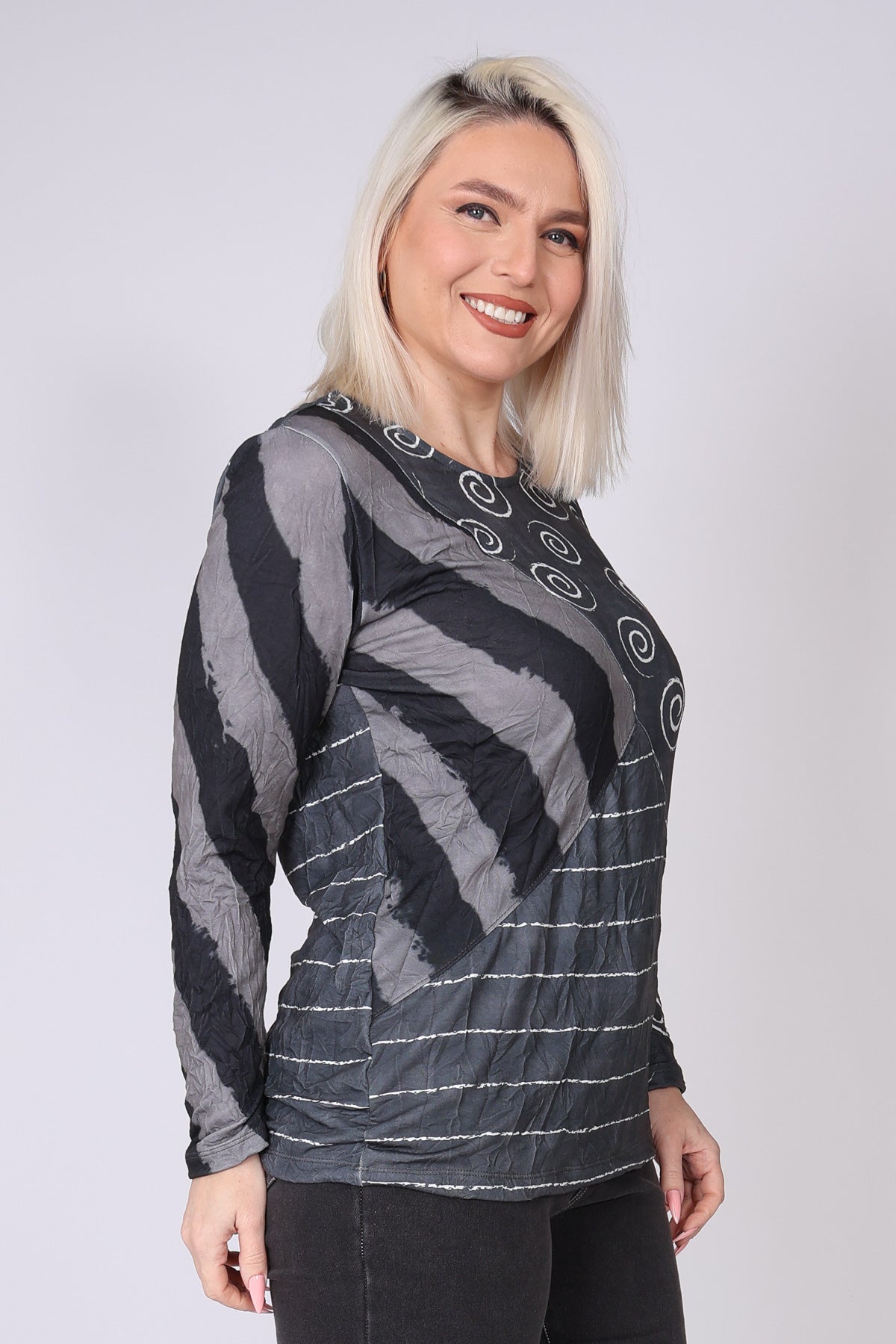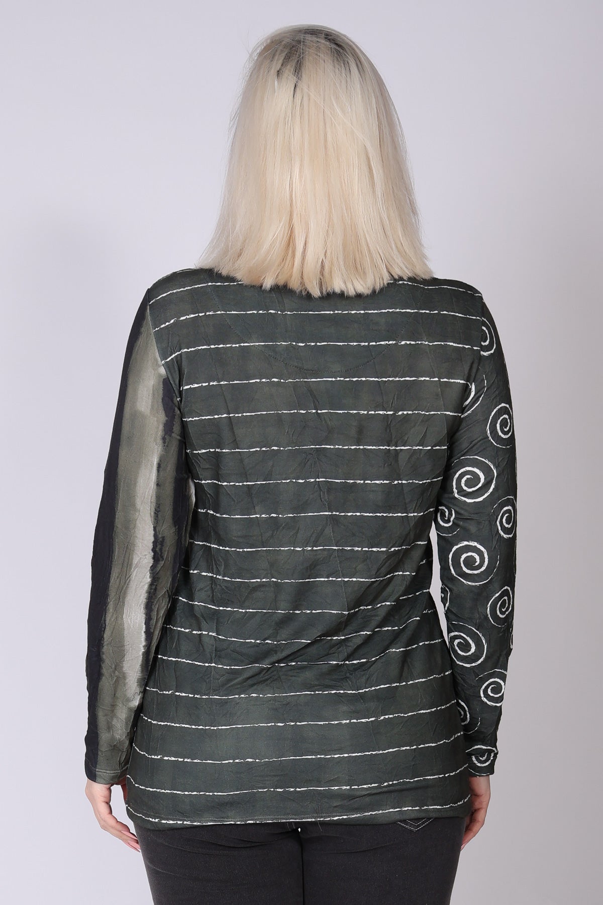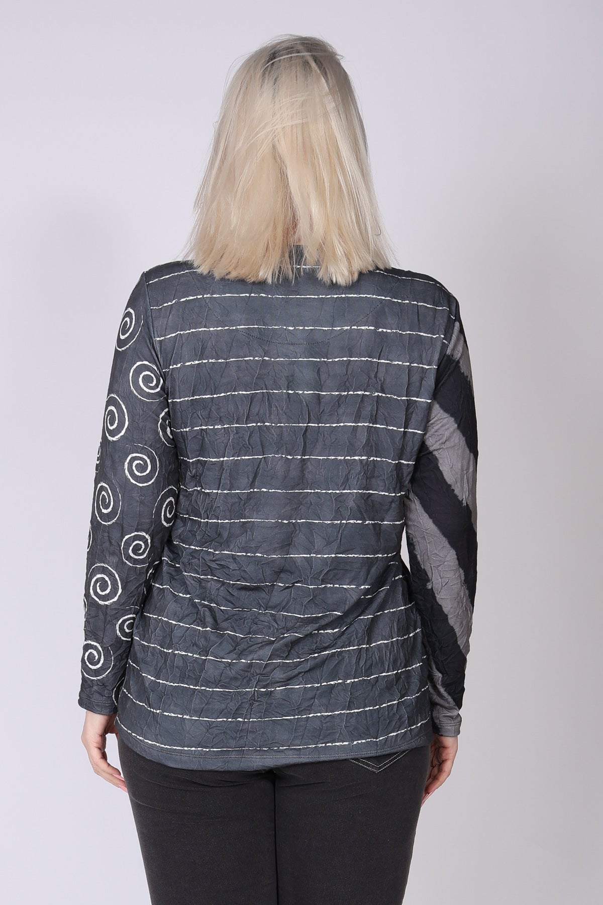 חולצה בגזרה משוחררת עשויה בד פרנץ’ טרי נעים, בשילוב בדים בדפוס ספירלות, פסים דקים ופסים עבים במראה מקומט, המחוברים בחיבור אלכסוני ייחודי. השילוב בין הטקסטורות יוצר מראה מעניין ולא מתאמץ. מפתח צוואר סירה ושרוולים ארוכים משלימים לוק נינוח ומוקפד. הבד רך, נעים ומתאים במיוחד לחורף הישראלי.