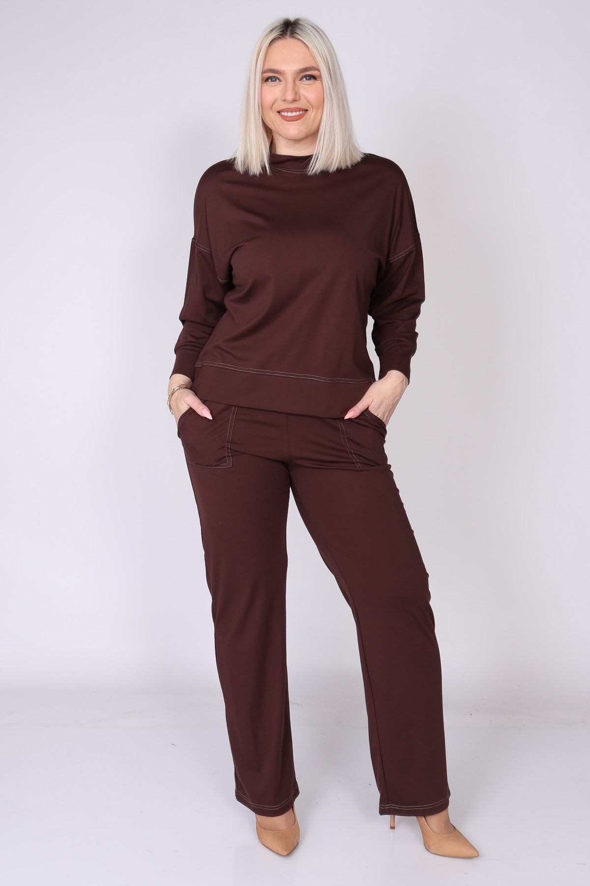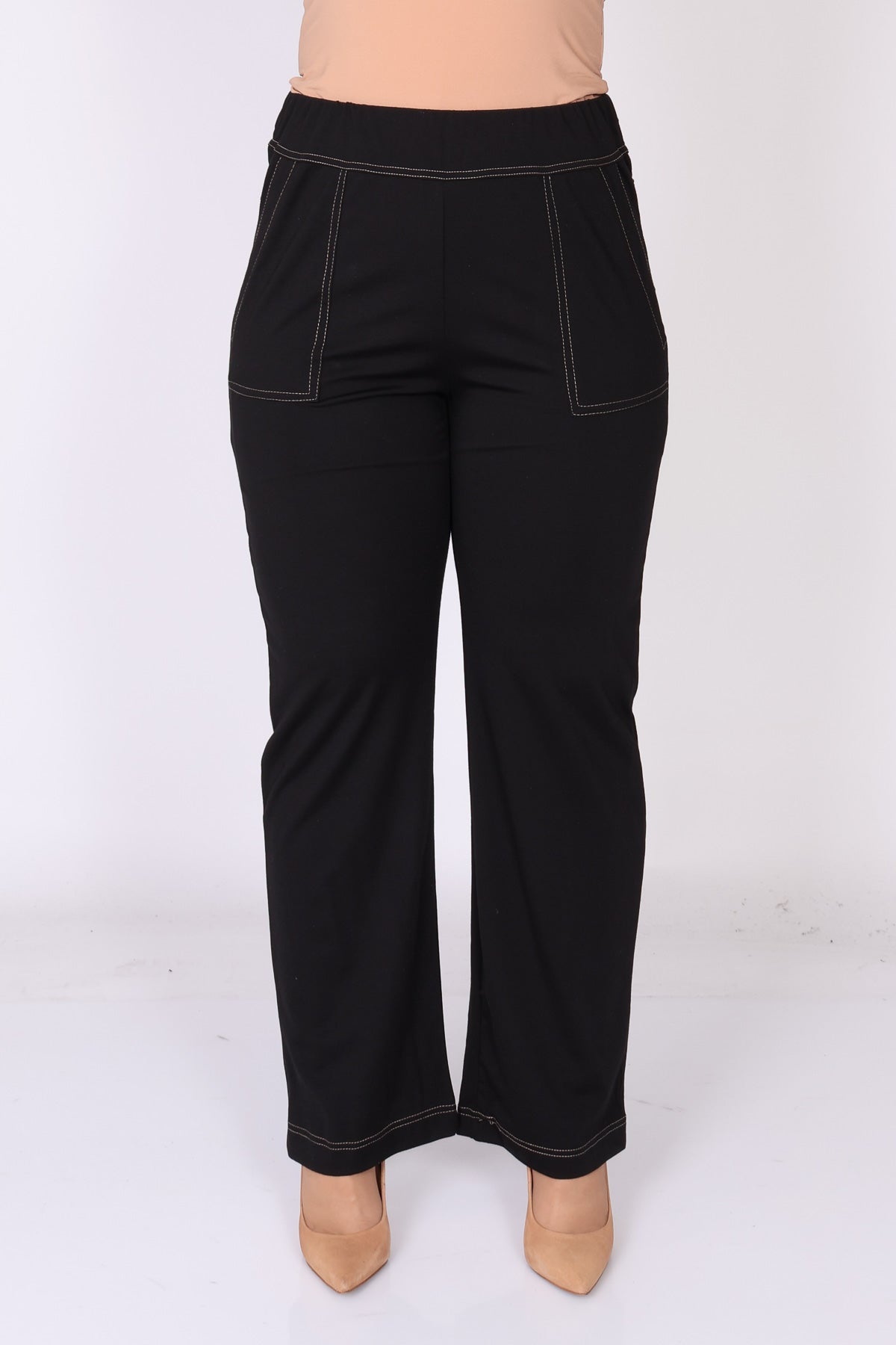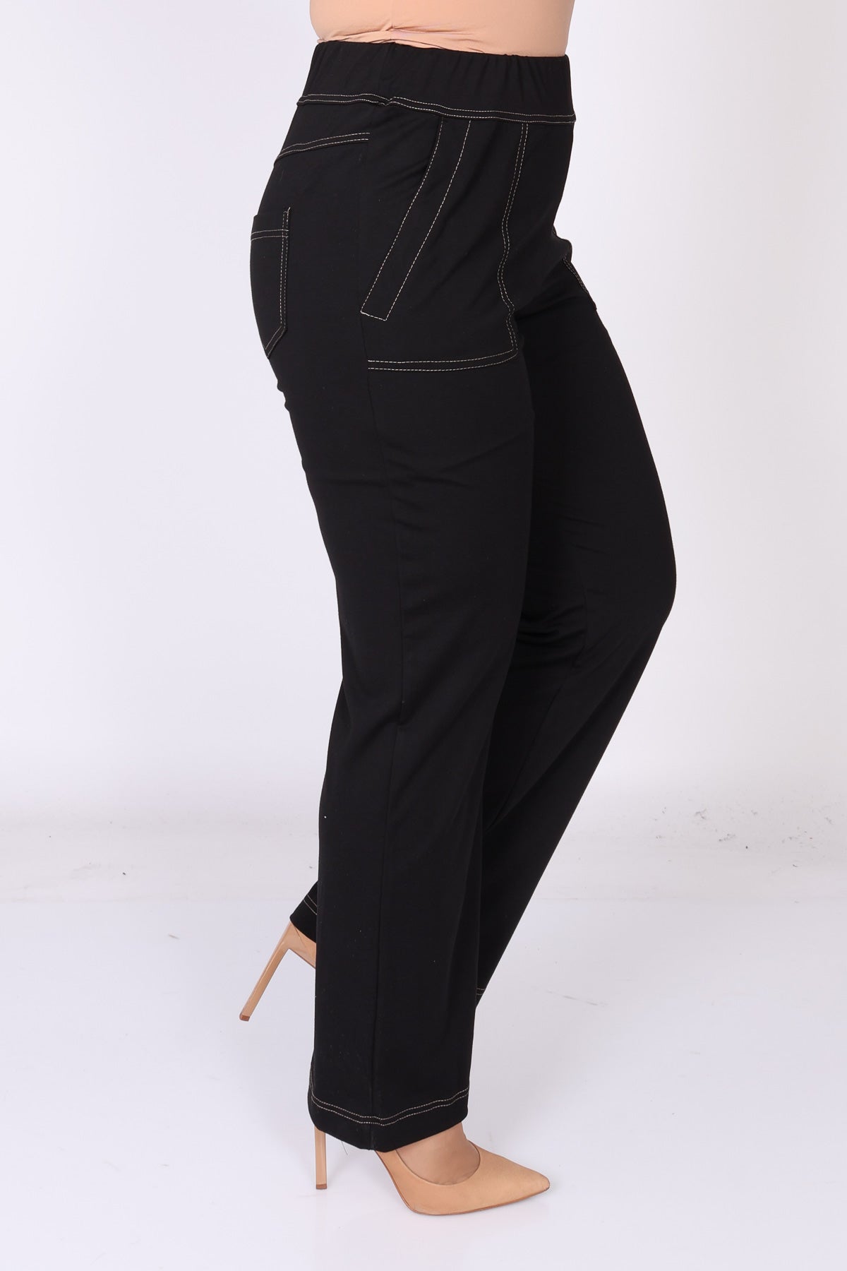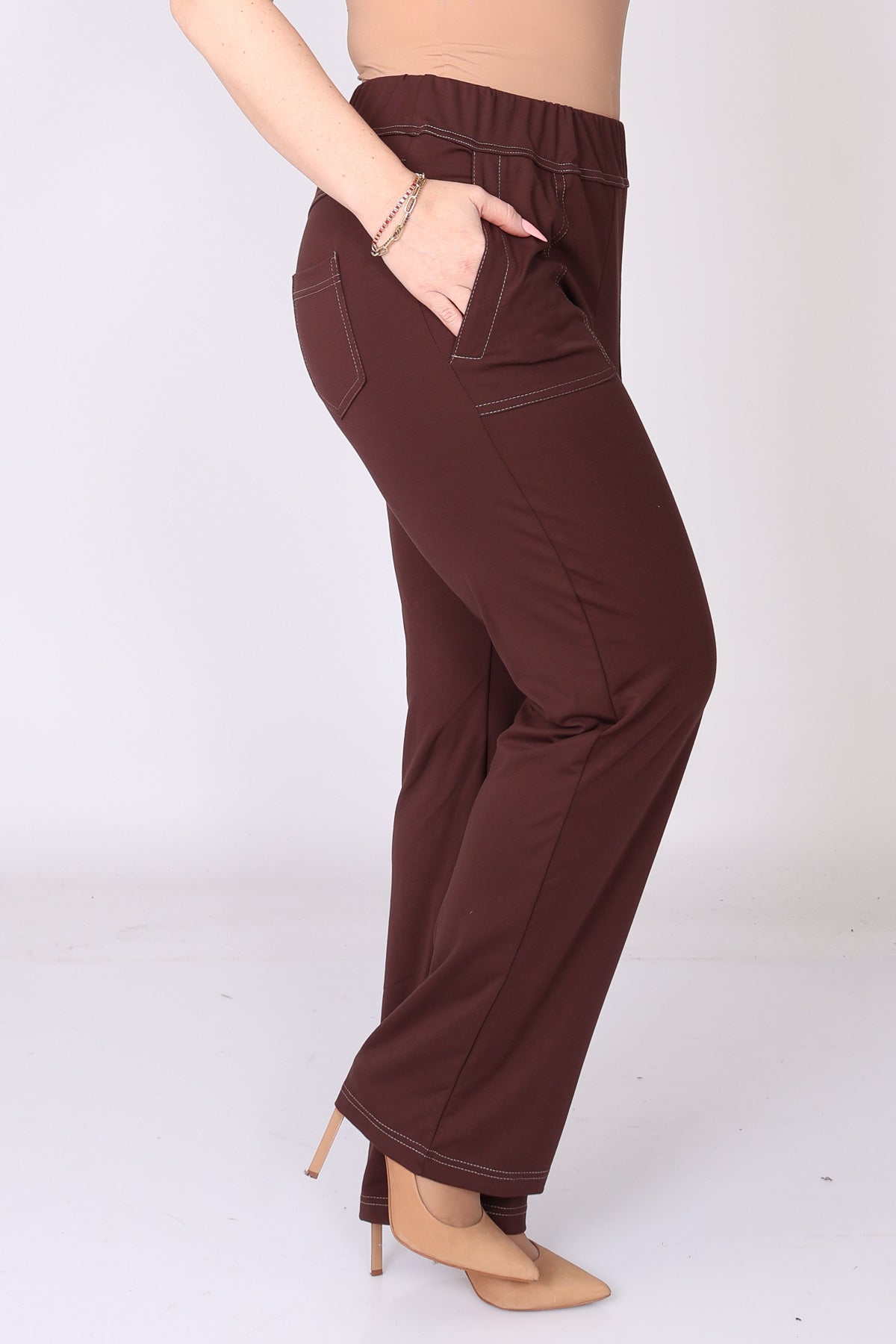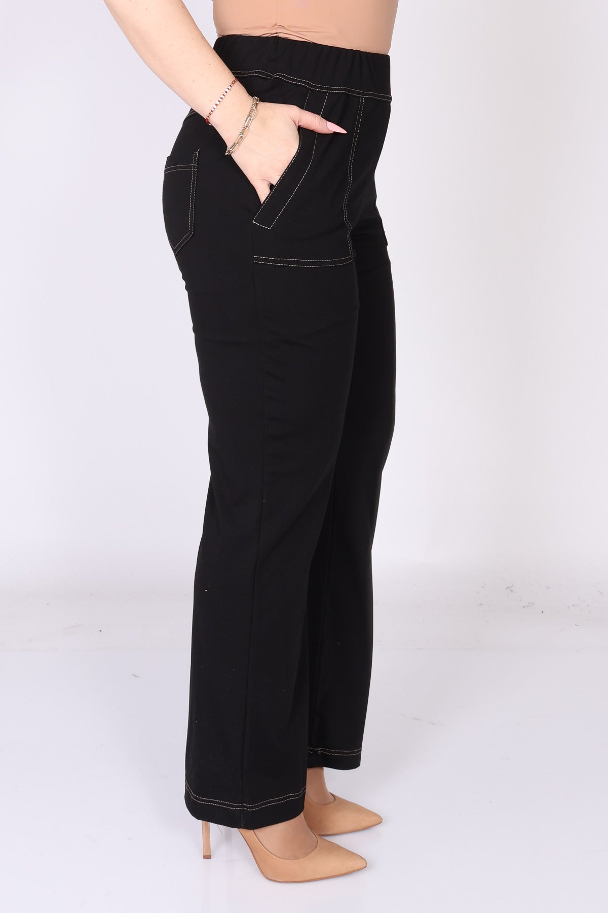 מכנס עם גומי במותן בגזרה ישרה, עם כיסים המודגשים בתיפור לבן שמוסיף נגיעה נקייה ומעודנת. הבד הרך והנעים יוצר מראה נינוח ומחמיא, כזה שמתאים ללבישה יומיומית ולשילוב קל עם פריטים שונים בארון.