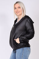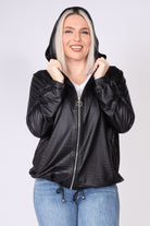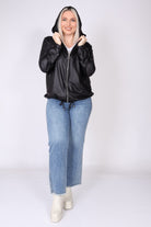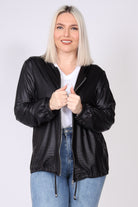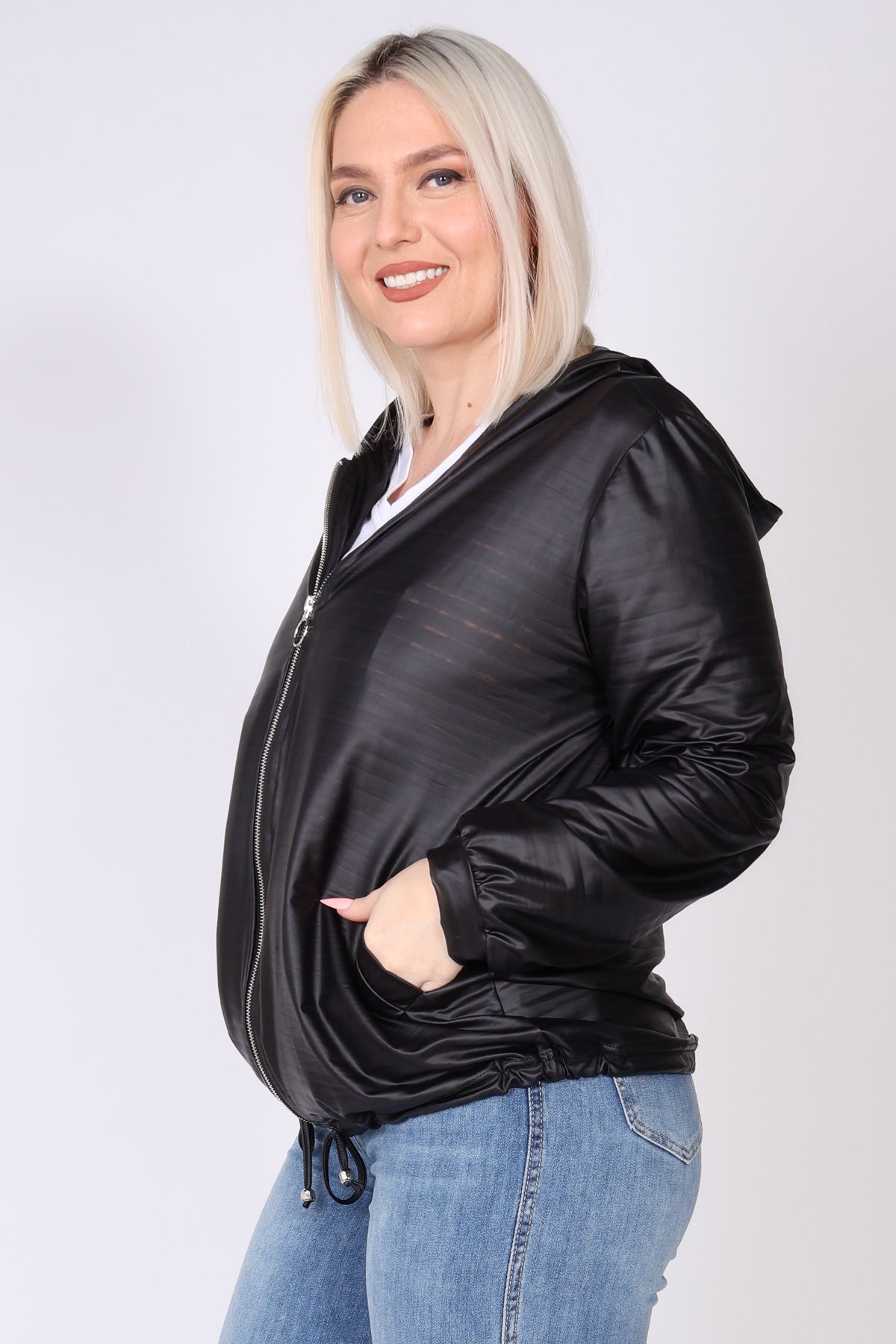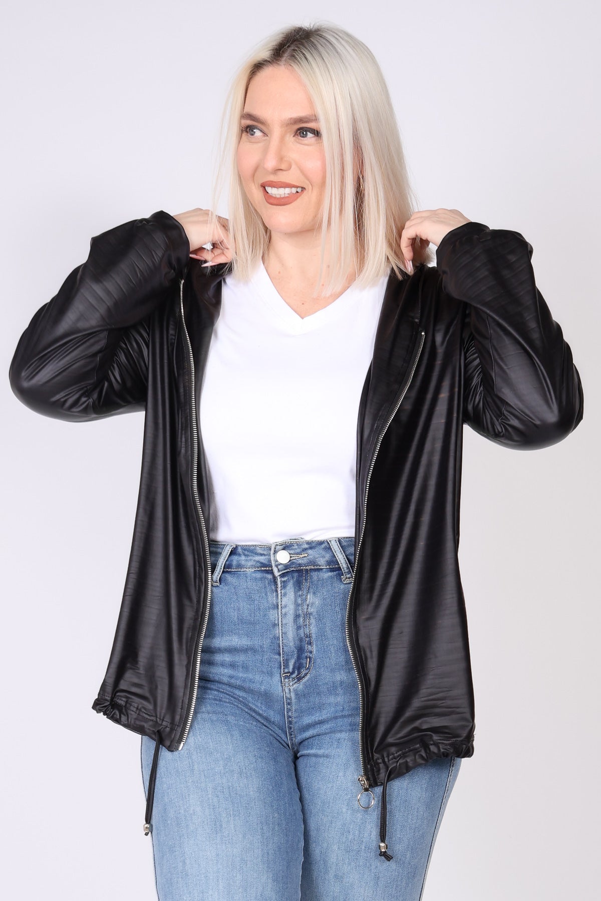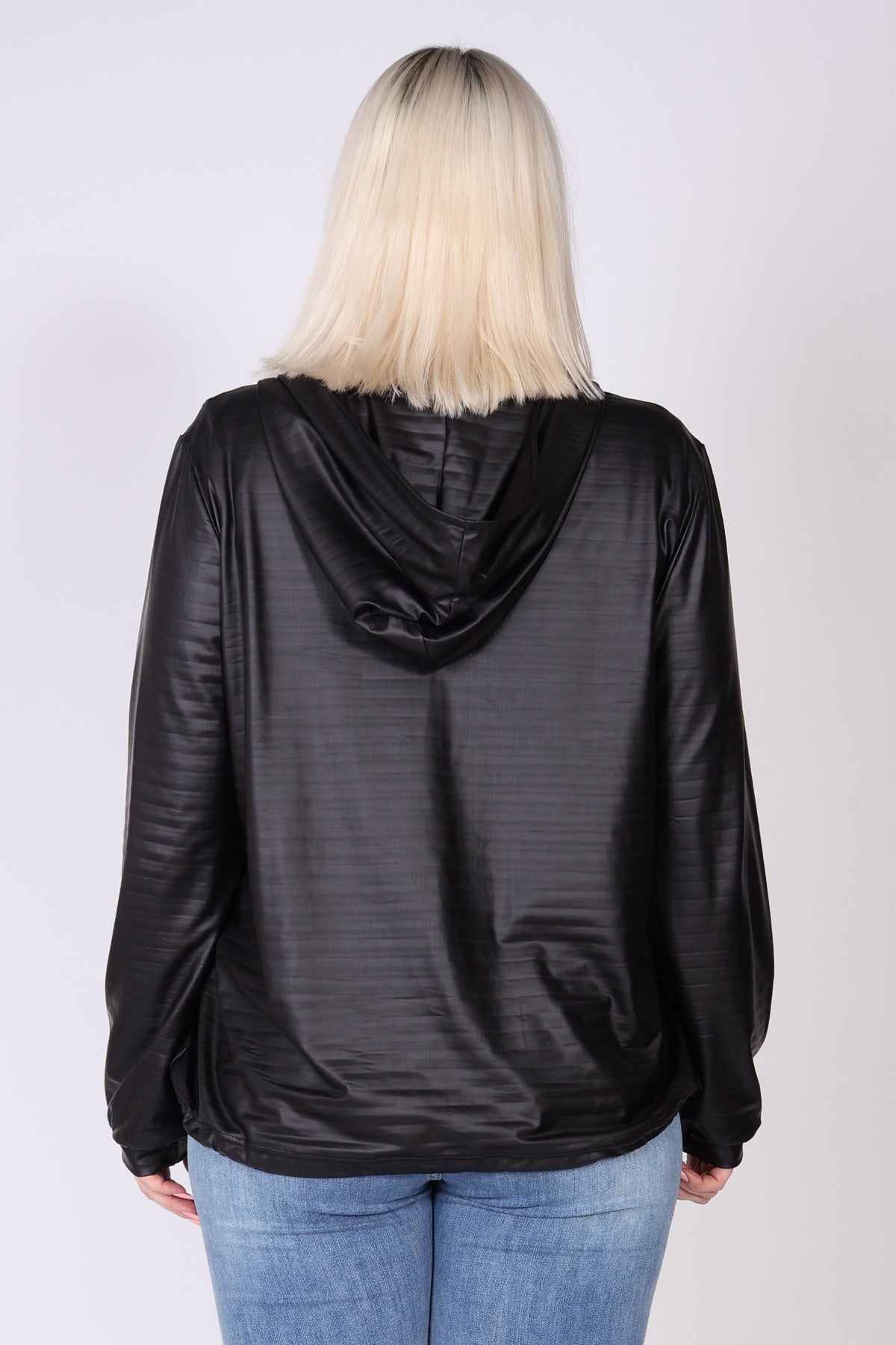 עליונית מבד דמוי עור בעיצוב עדין ומודרני, עם שרוולים ארוכים וסיומת מנג’ט שמעניקה מראה נקי ומחמיא. הכובע לאחור מוסיף נופך קז’ואלי עם נוכחות, וסגירת רוכסן ברזל יוצרת קו חד ומדויק. שרוך כיווץ במותן מאפשר התאמה אישית ומוסיף מראה מחויט ועדין, שמקפיץ כל שילוב.