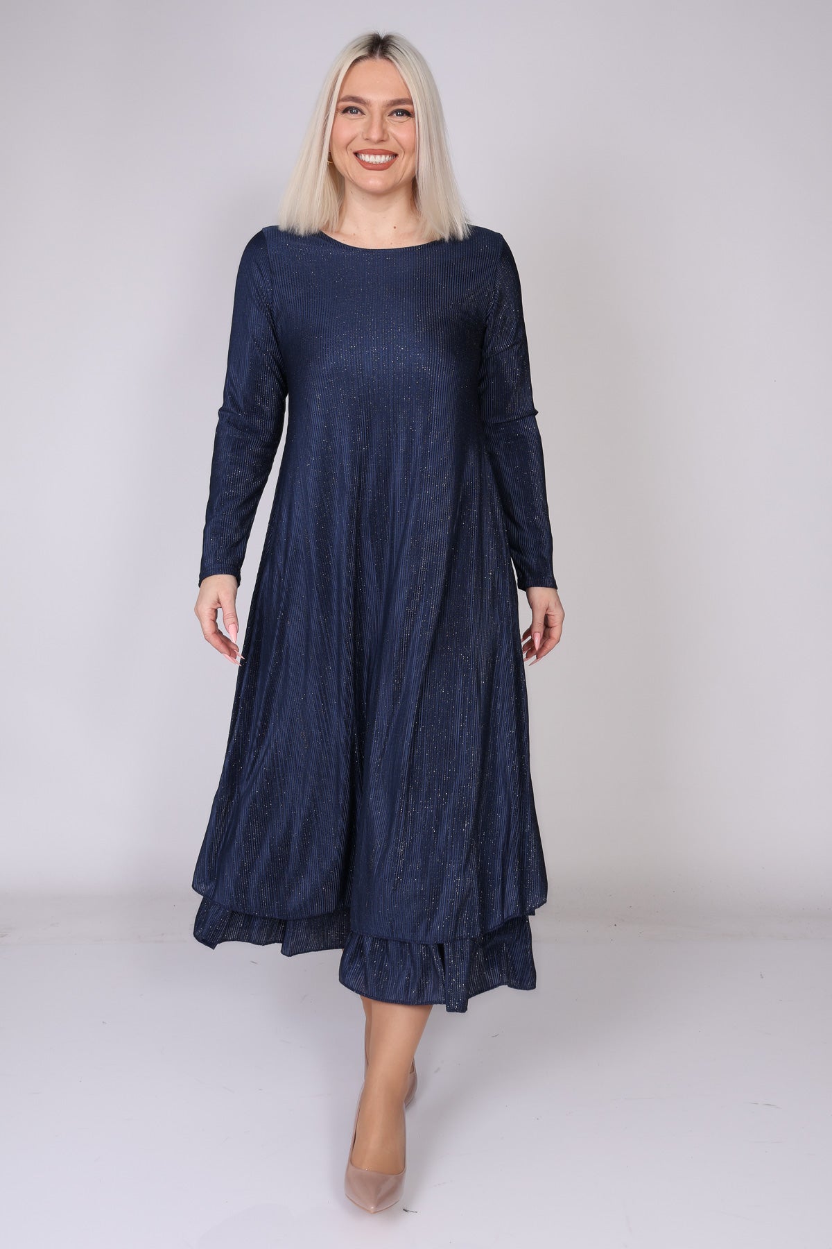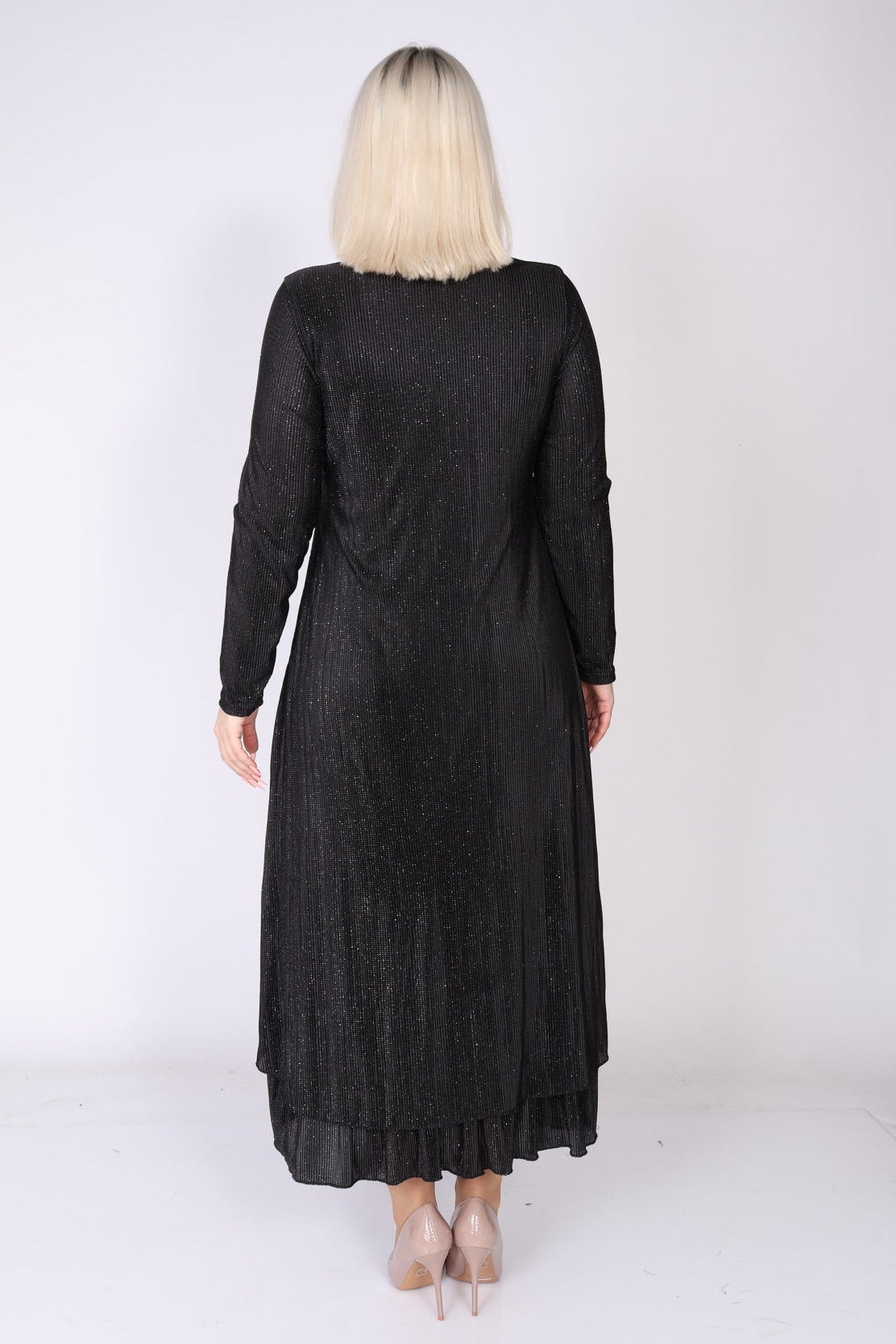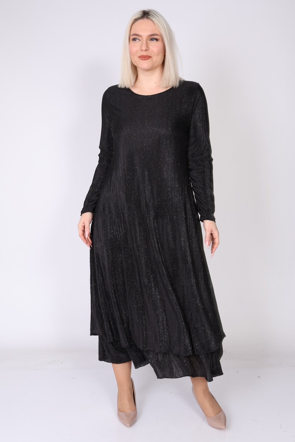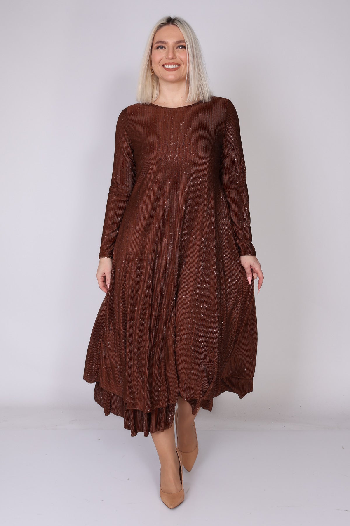 שמלת ערב מבד לורקס במראה יוקרתי, בגזרה נשפכת עם סיומת וולנים נשית ועדינה. מפתח צוואר עגול ושרוולים ארוכים משלימים את המראה האלגנטי, עם נפילה מחמיאה שמעניקה תחושת קלילות ויוקרה בו זמנית.