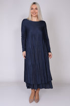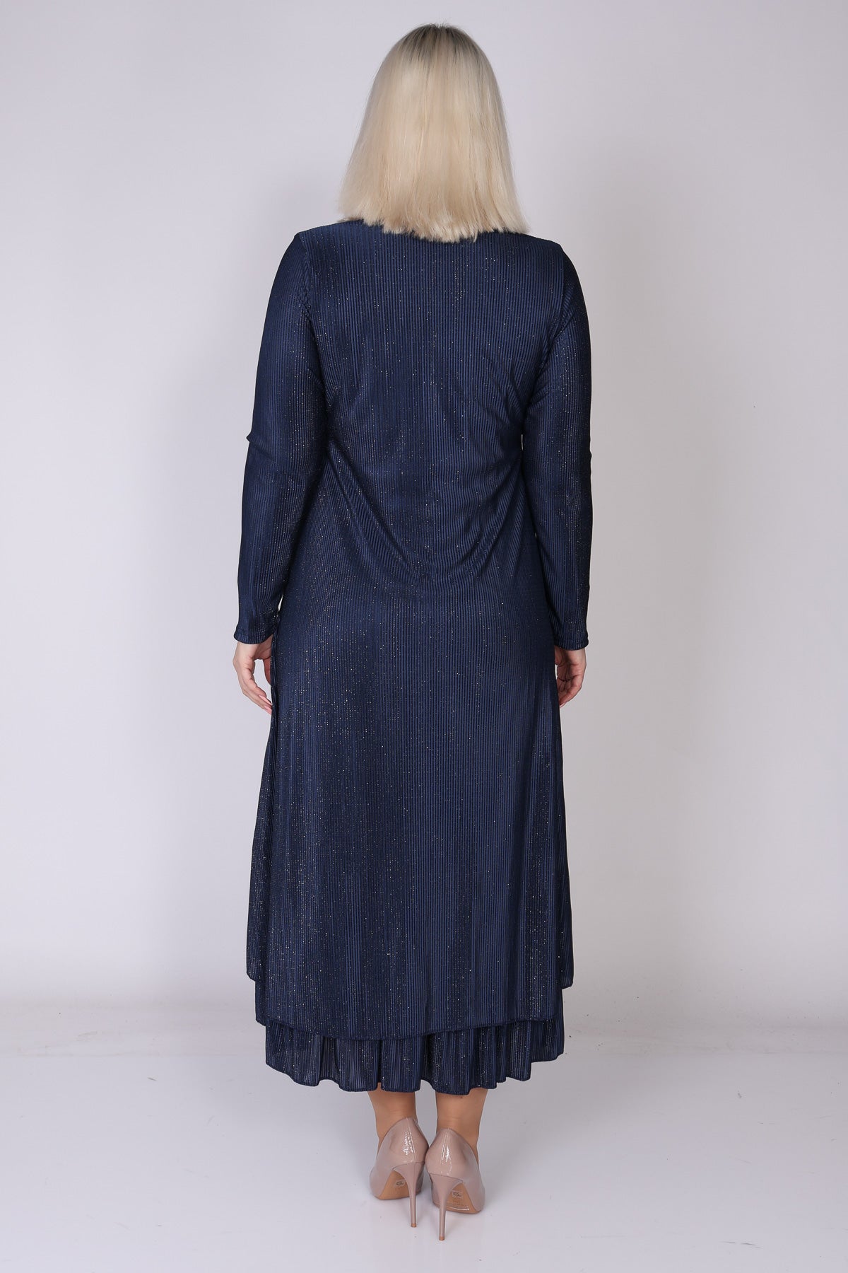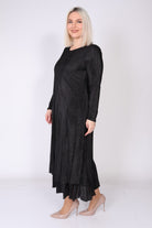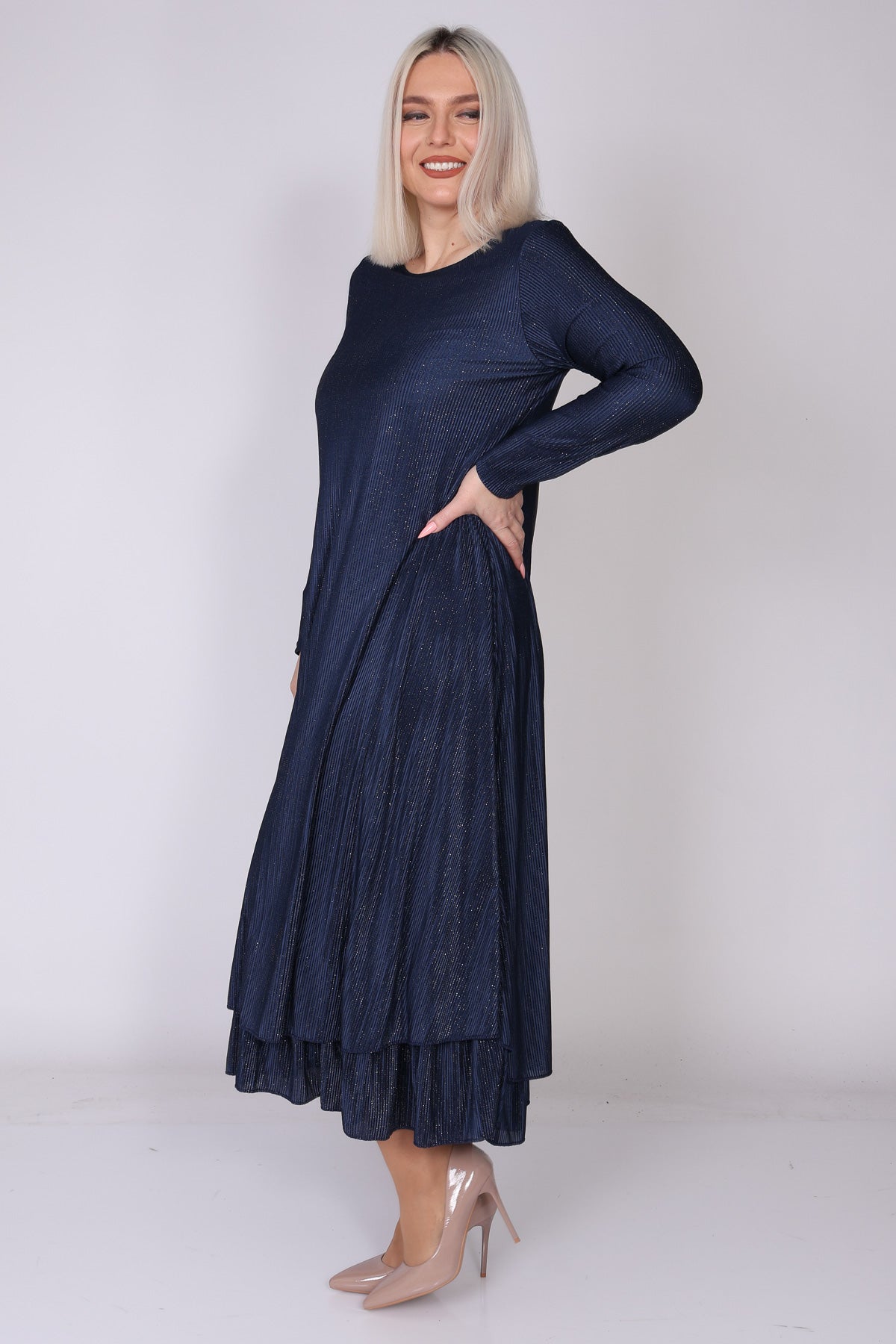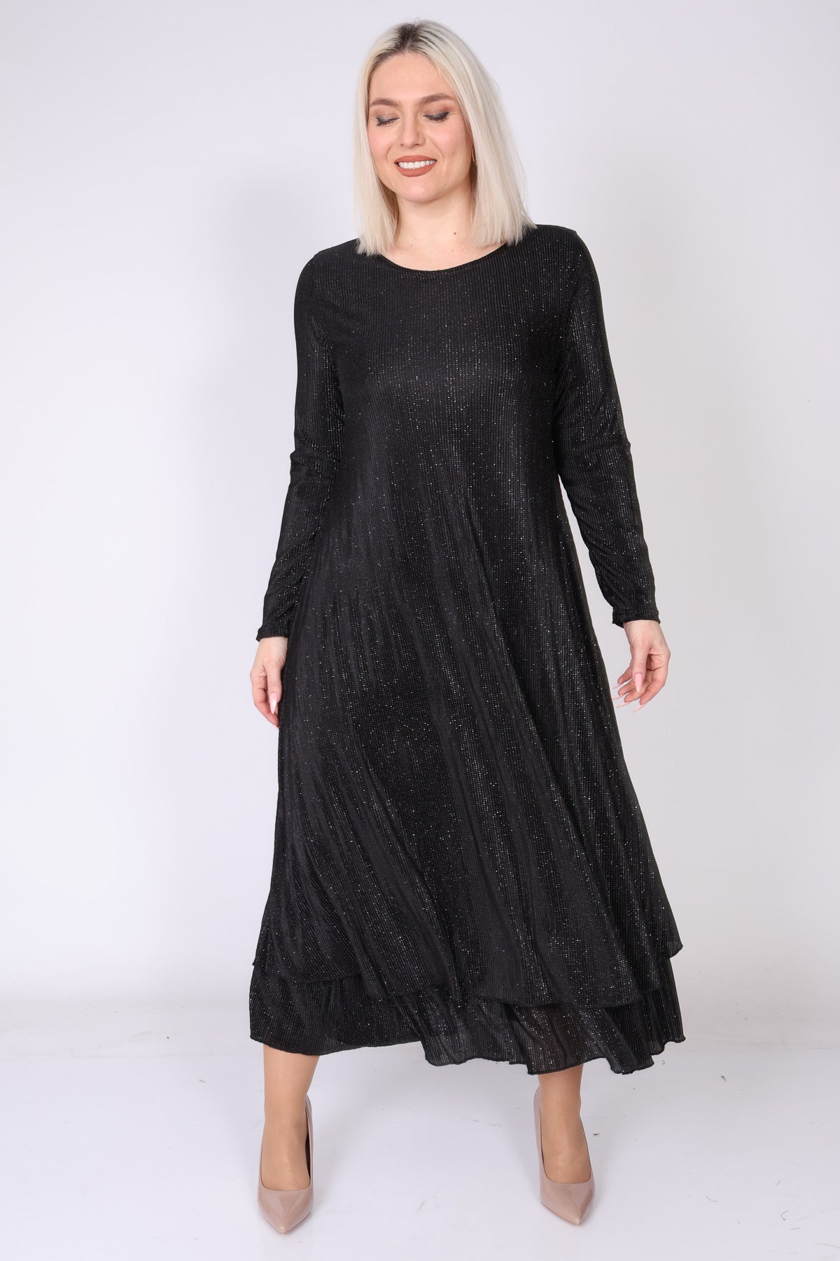 שמלת ערב מבד לורקס במראה יוקרתי, בגזרה נשפכת עם סיומת וולנים נשית ועדינה. מפתח צוואר עגול ושרוולים ארוכים משלימים את המראה האלגנטי, עם נפילה מחמיאה שמעניקה תחושת קלילות ויוקרה בו זמנית.