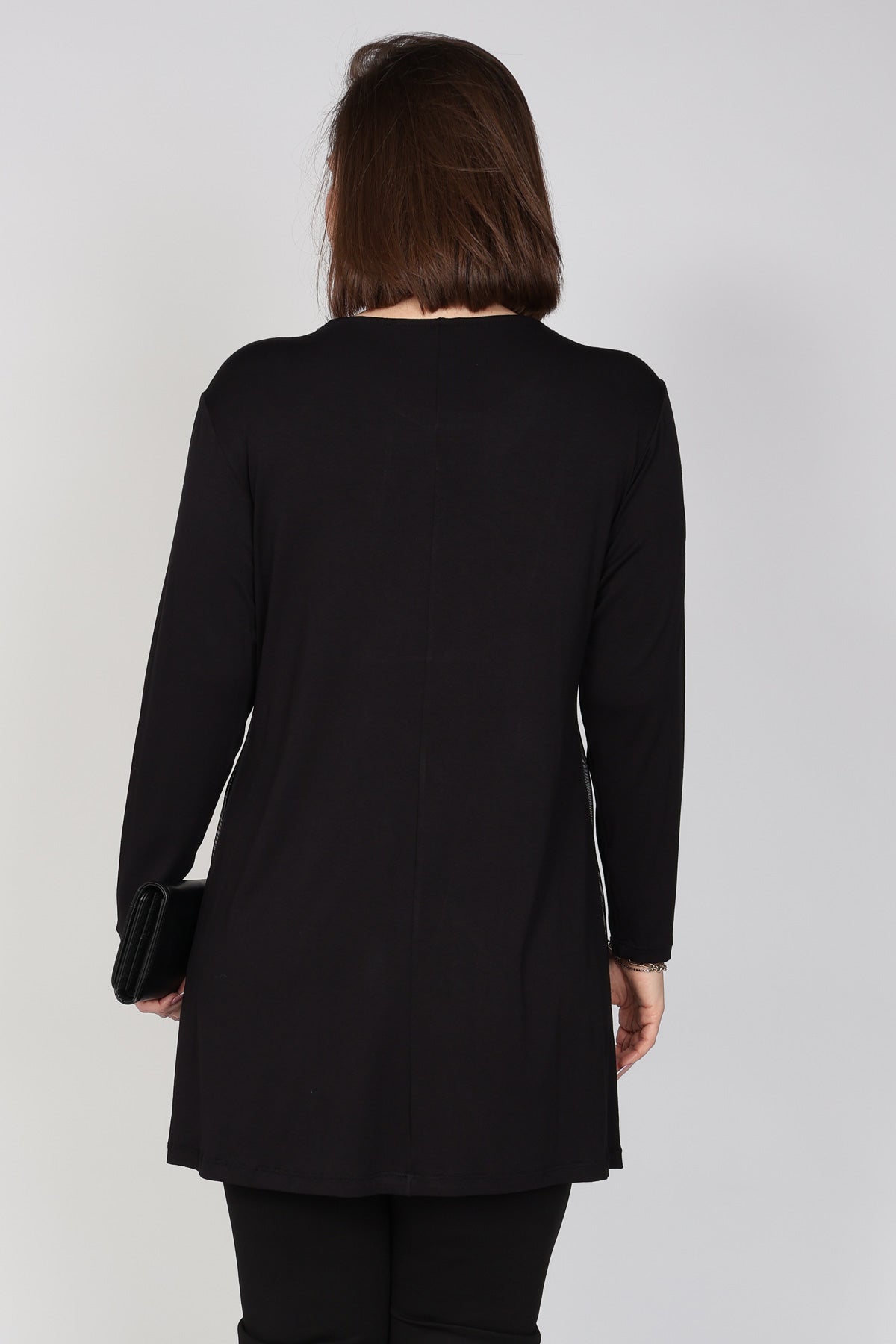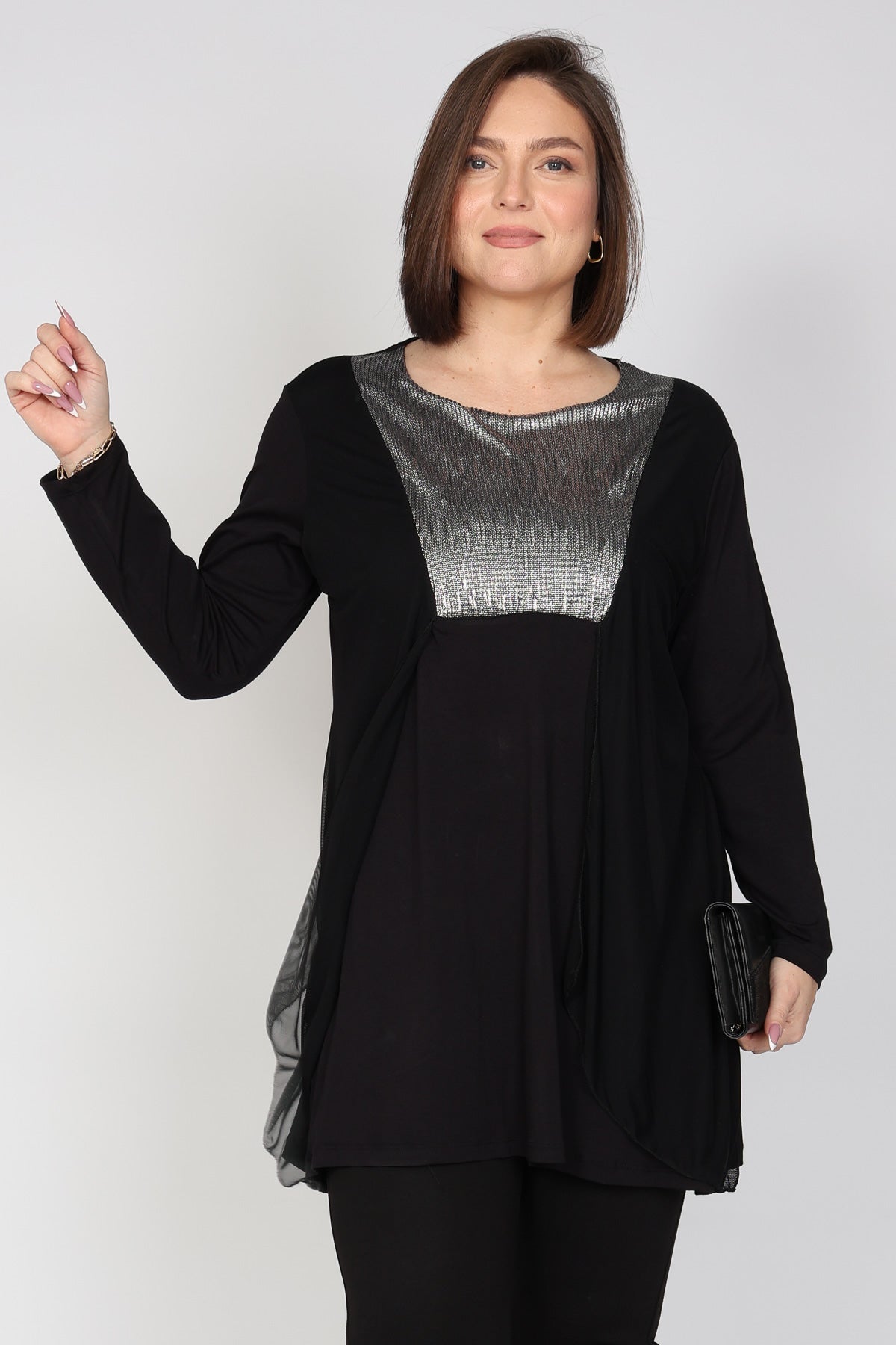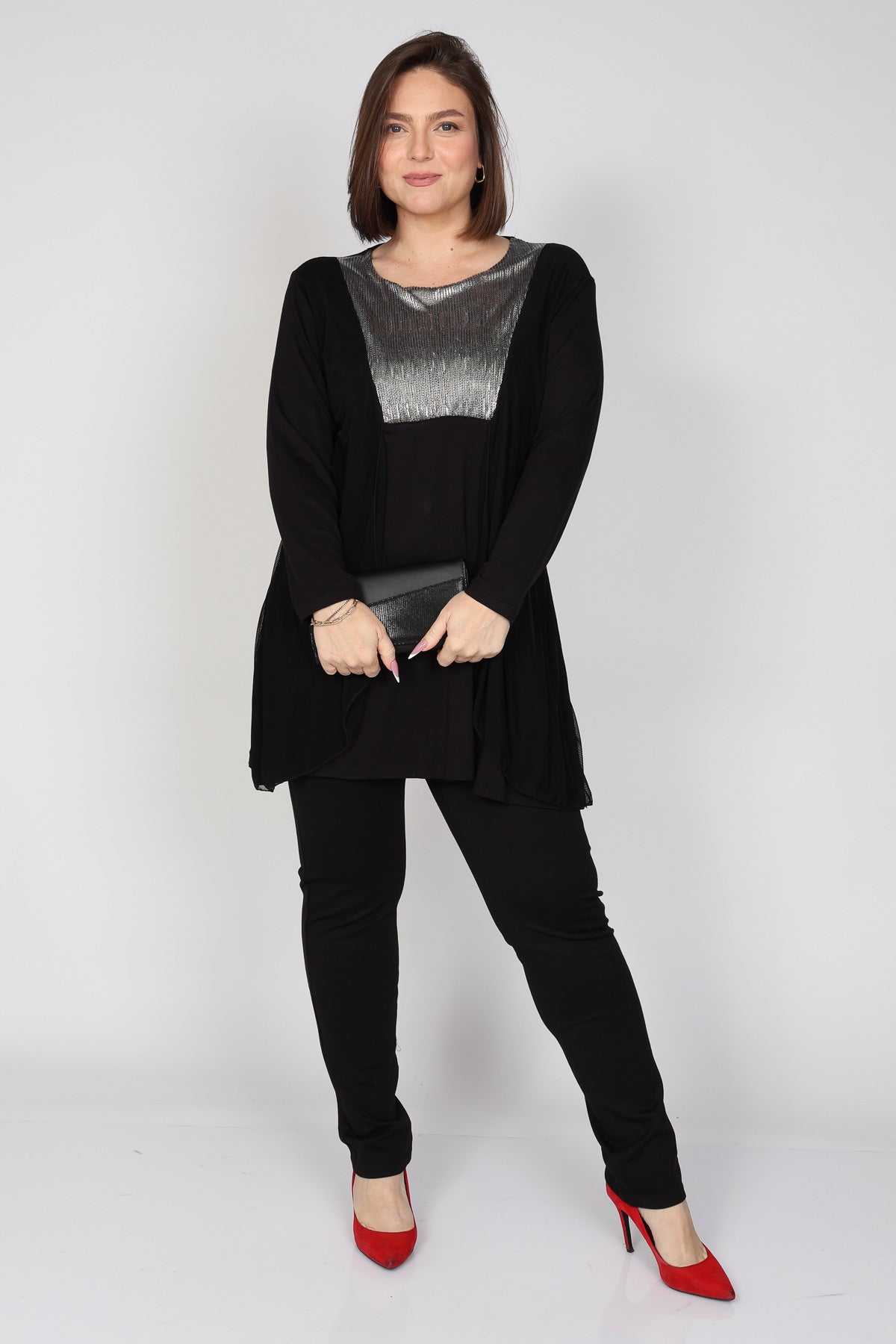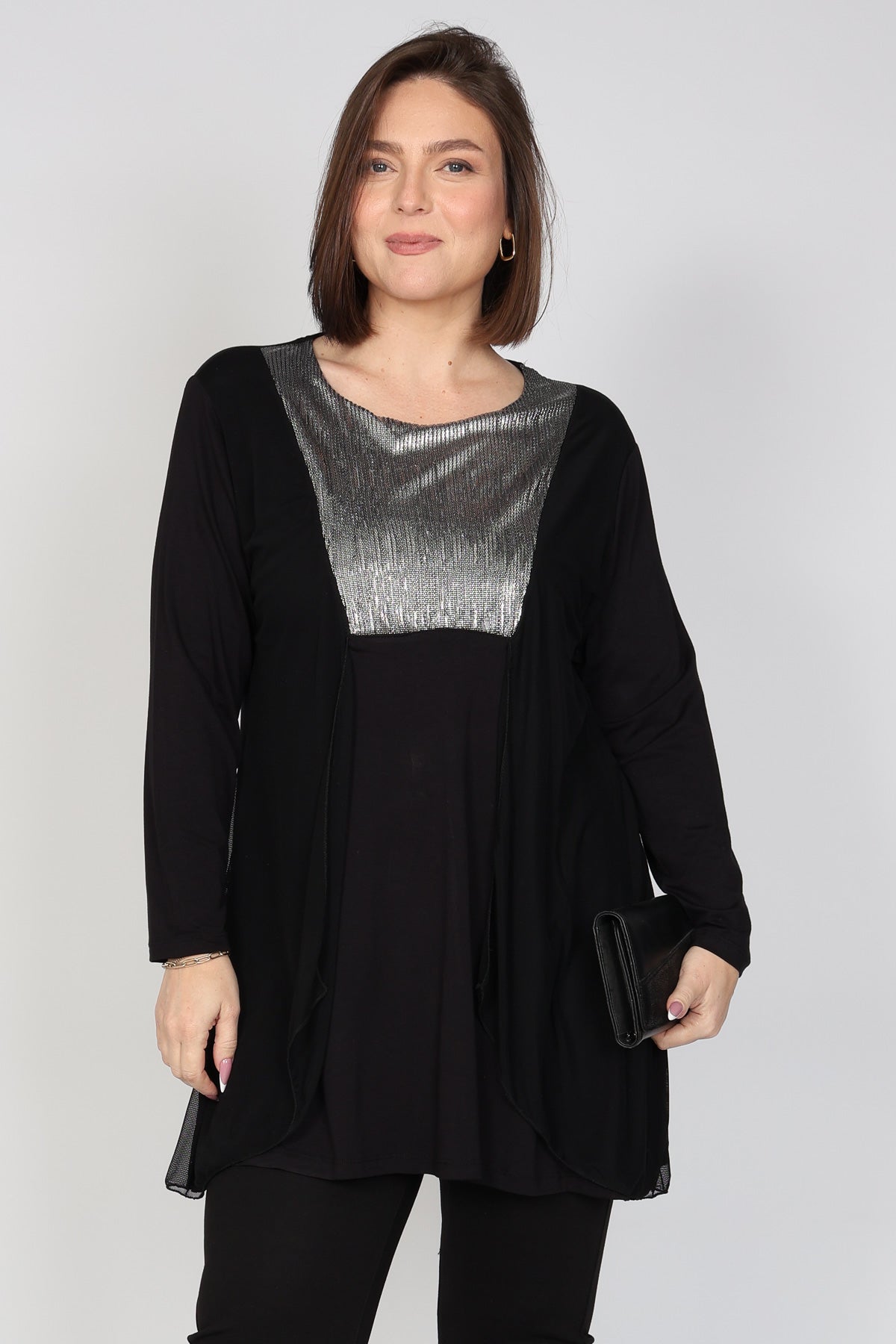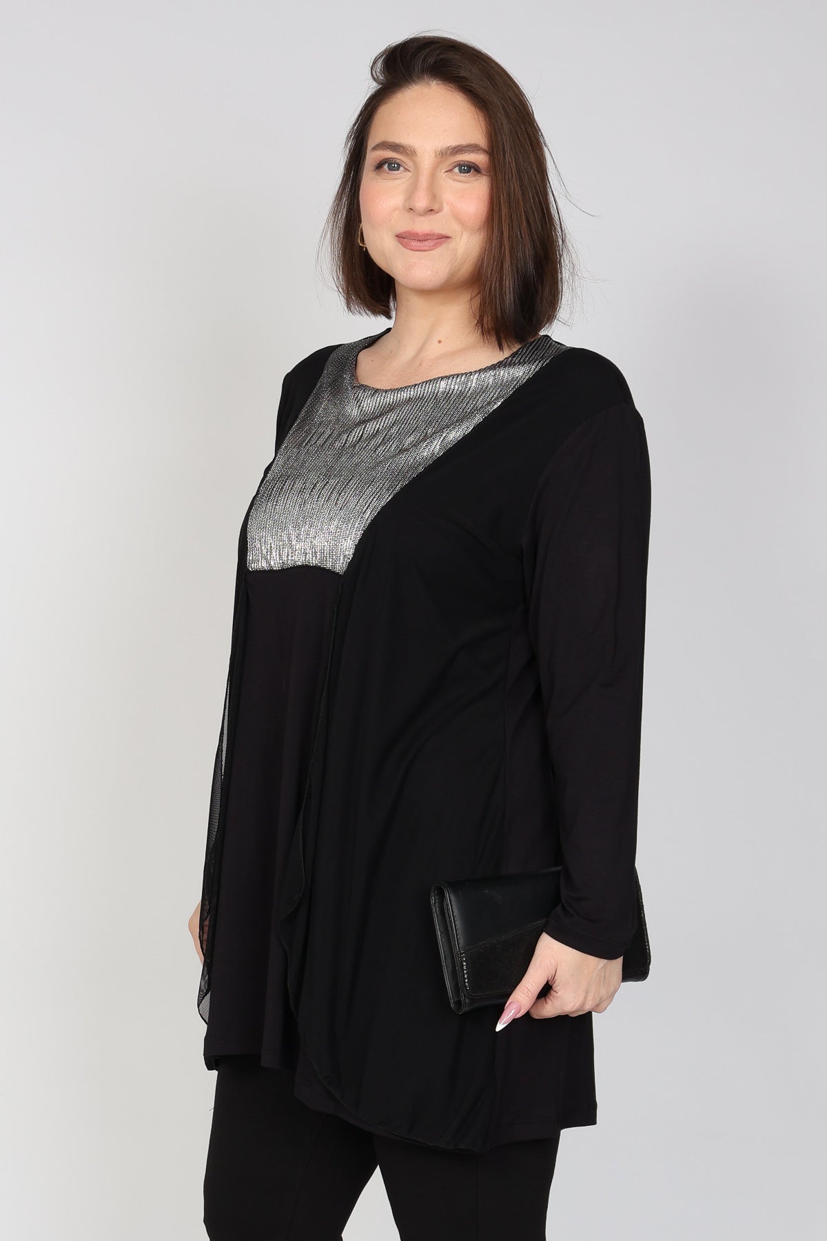 - טוניקת ערב בגזרה מתרחבת קלות בשילוב בד רזיל ועיטור כסף בחזה