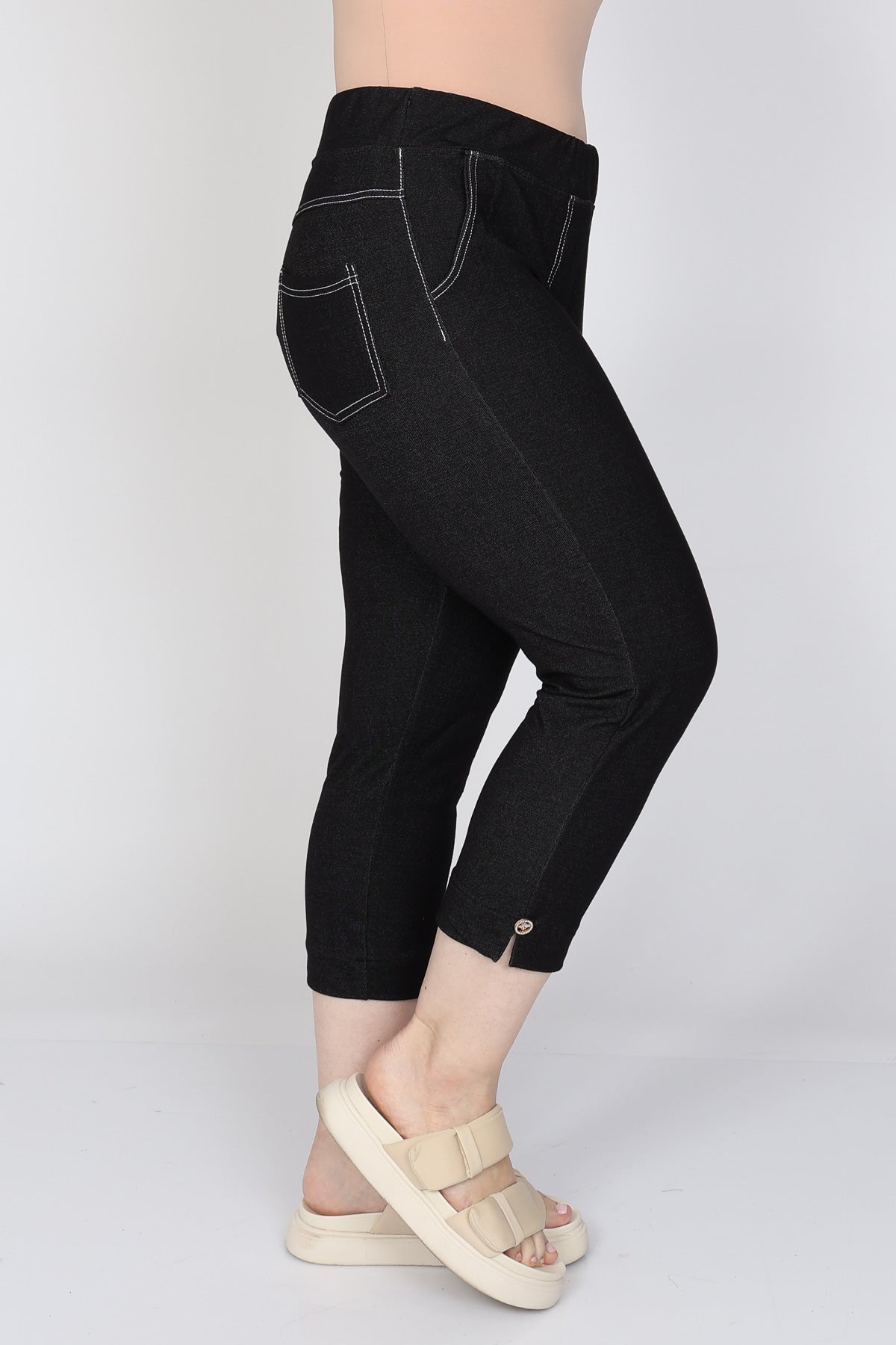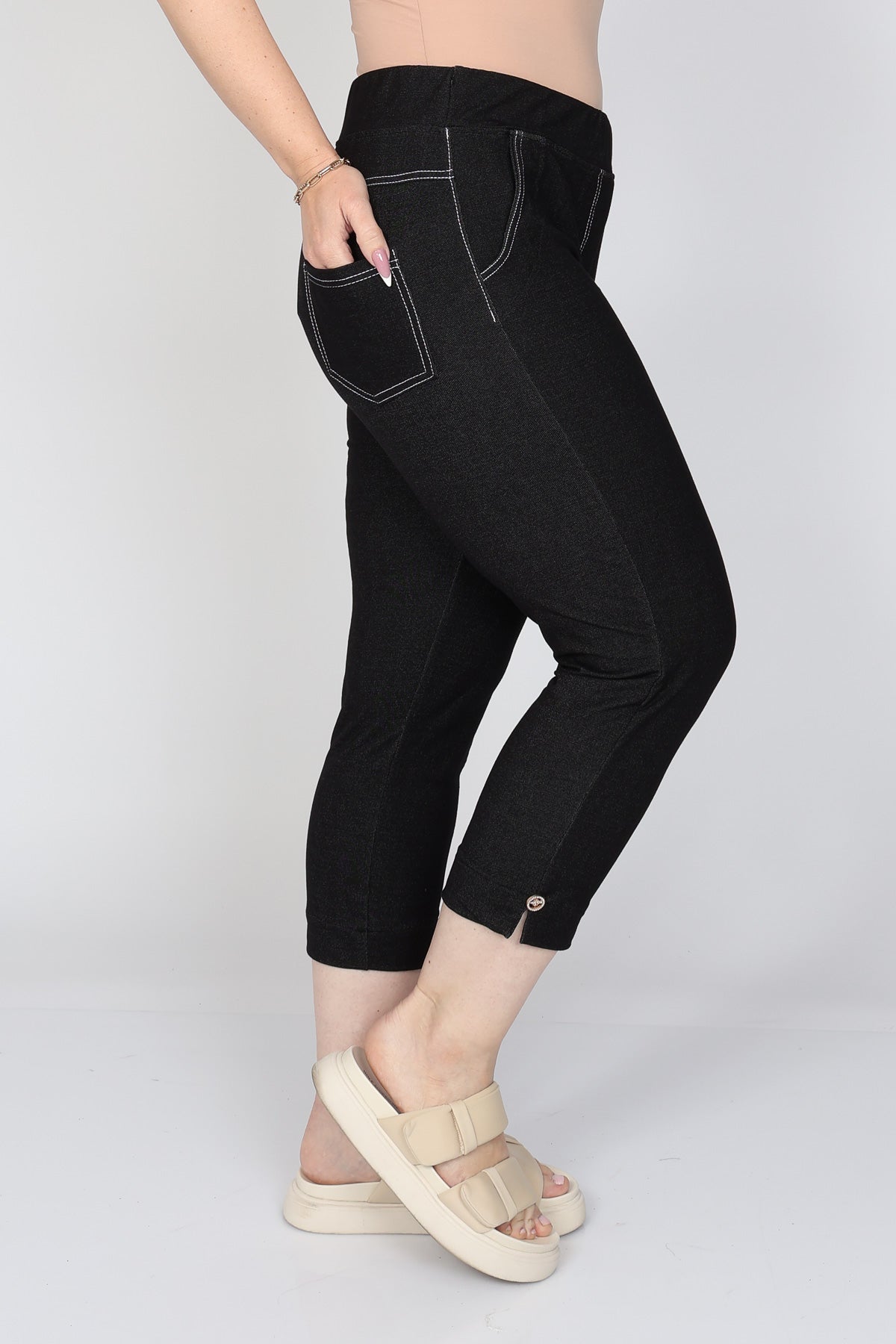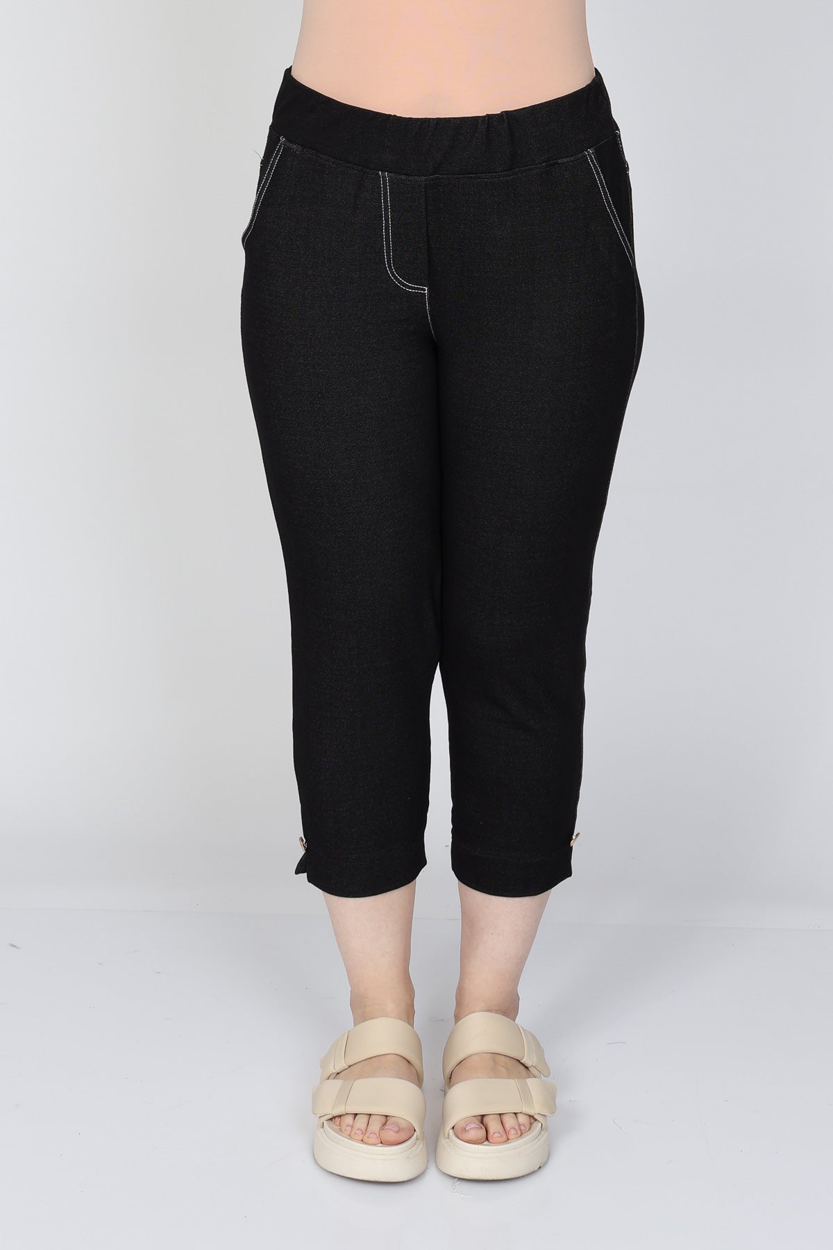 - מכנס עם גומי במותן באורך 7/8, עם שני שסעים קטנים בסיומת, תיפורים לבנים ושני כיסים
