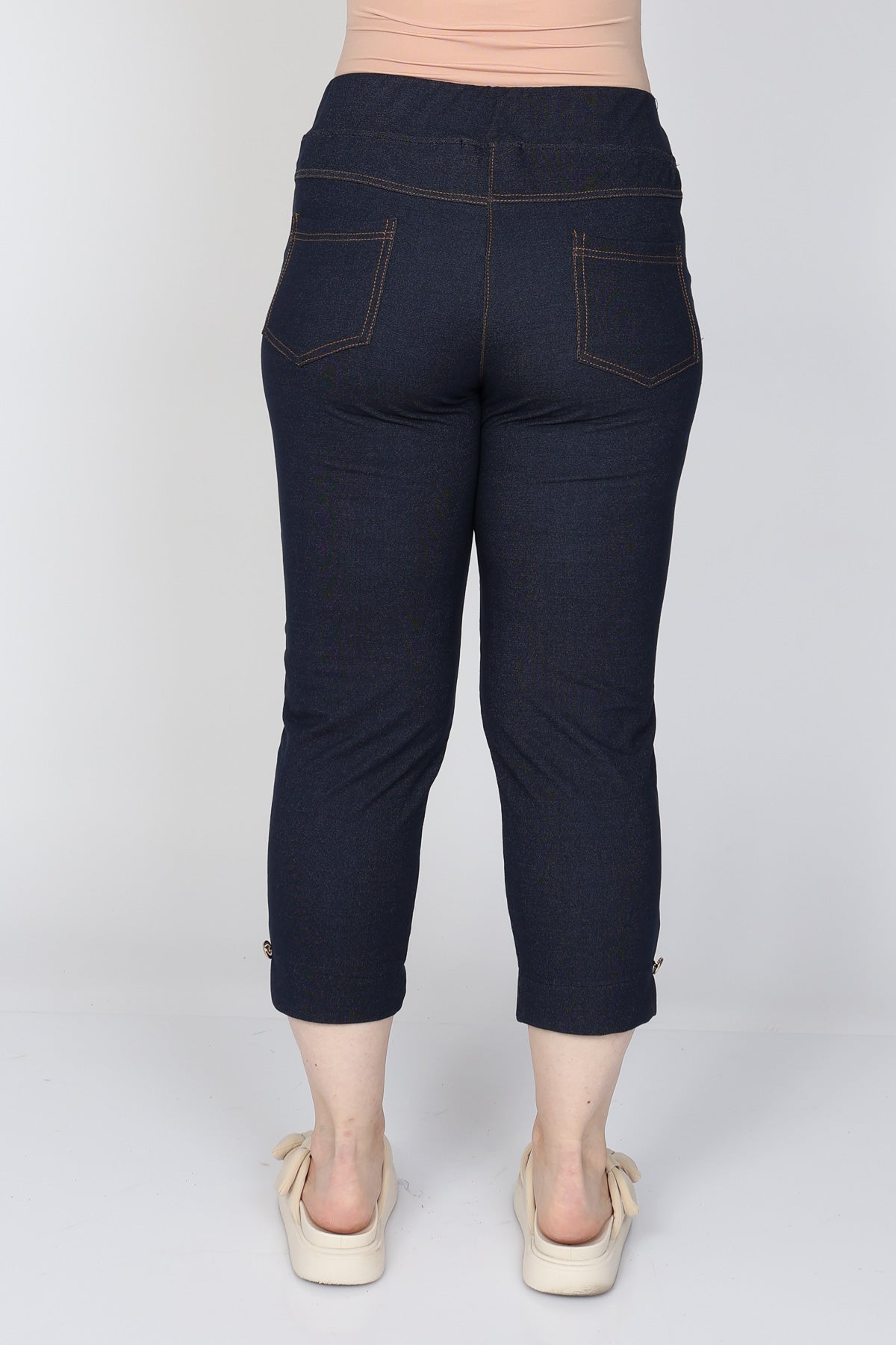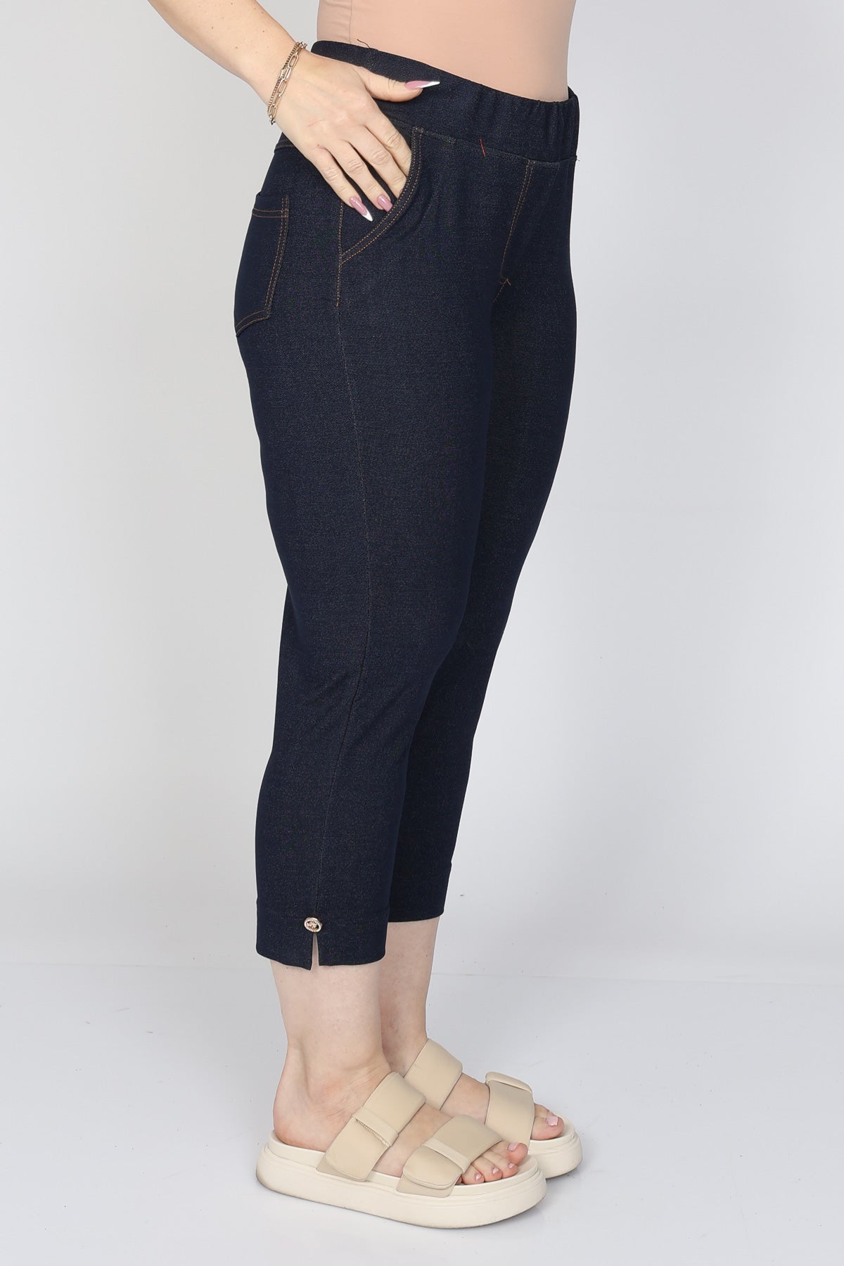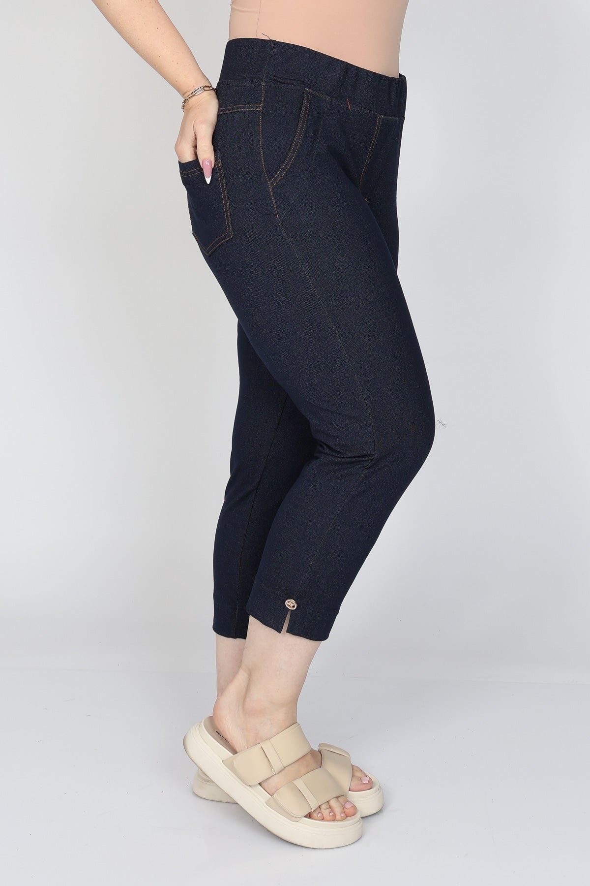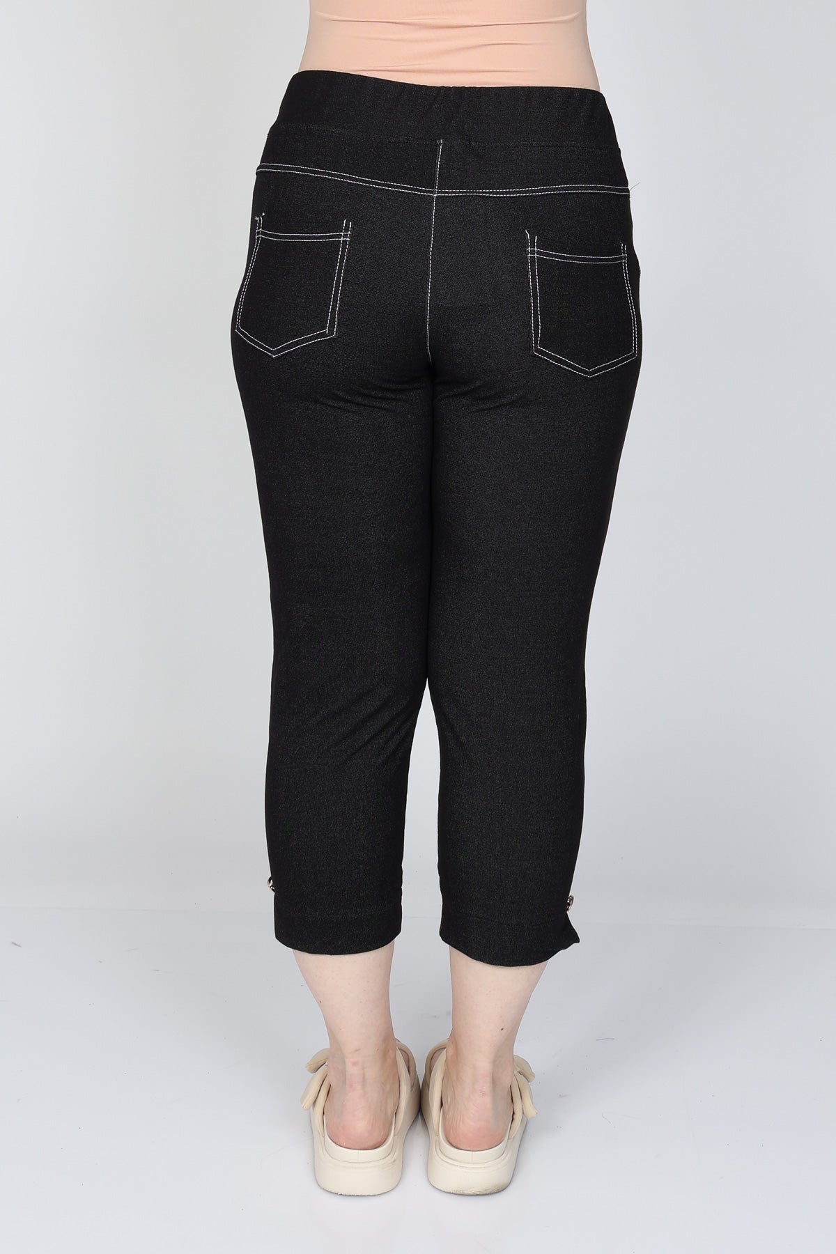 - מכנס עם גומי במותן באורך 7/8, עם שני שסעים קטנים בסיומת, תיפורים לבנים ושני כיסים