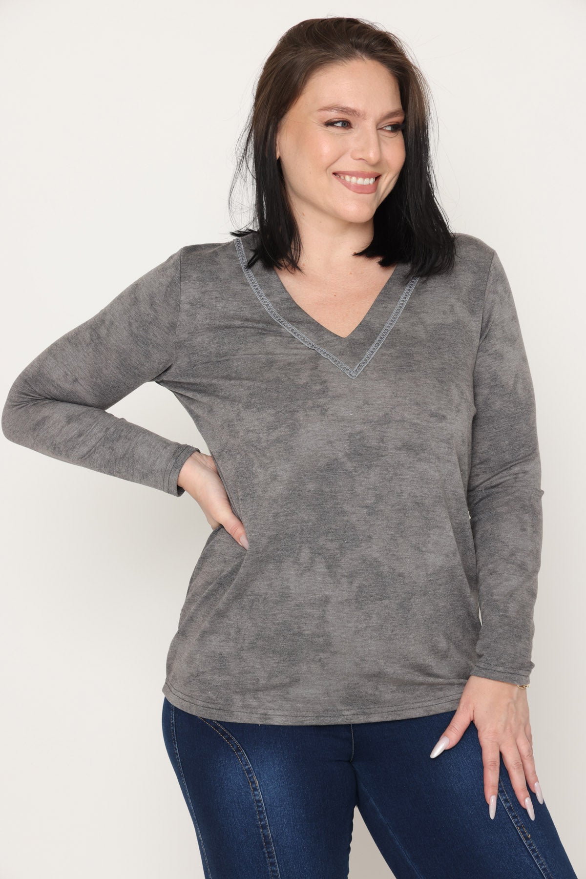- מפתח צוואר וי עם סרט עיטור ושרוולים ארוכים