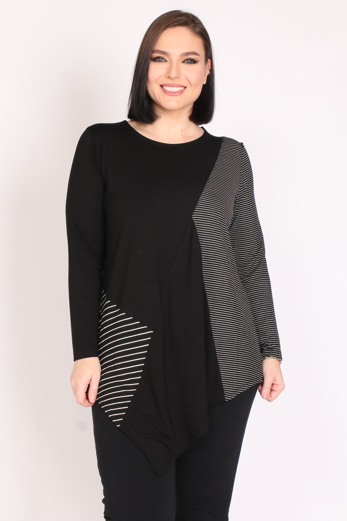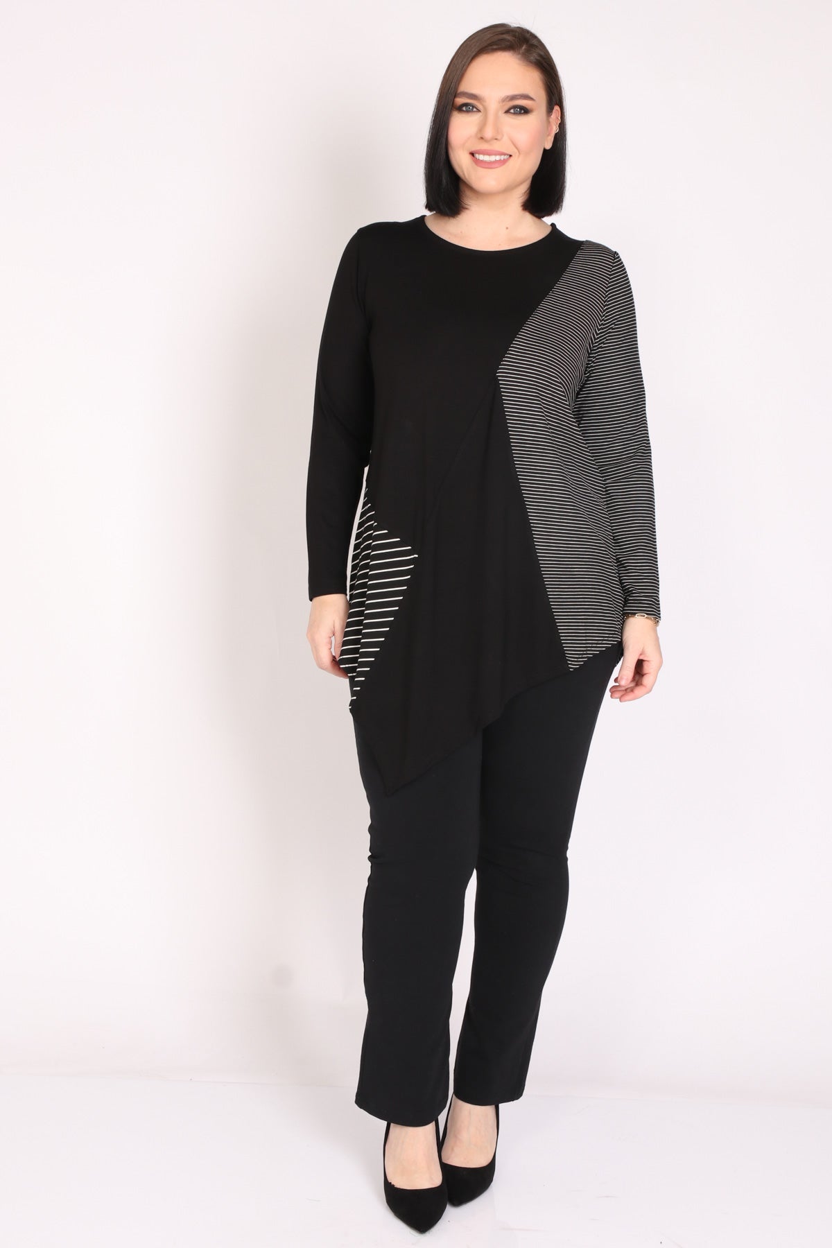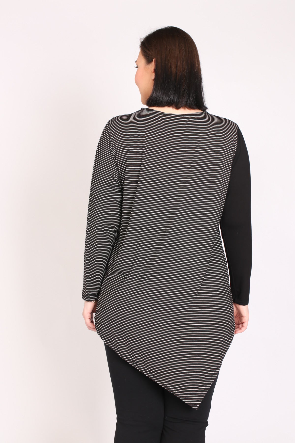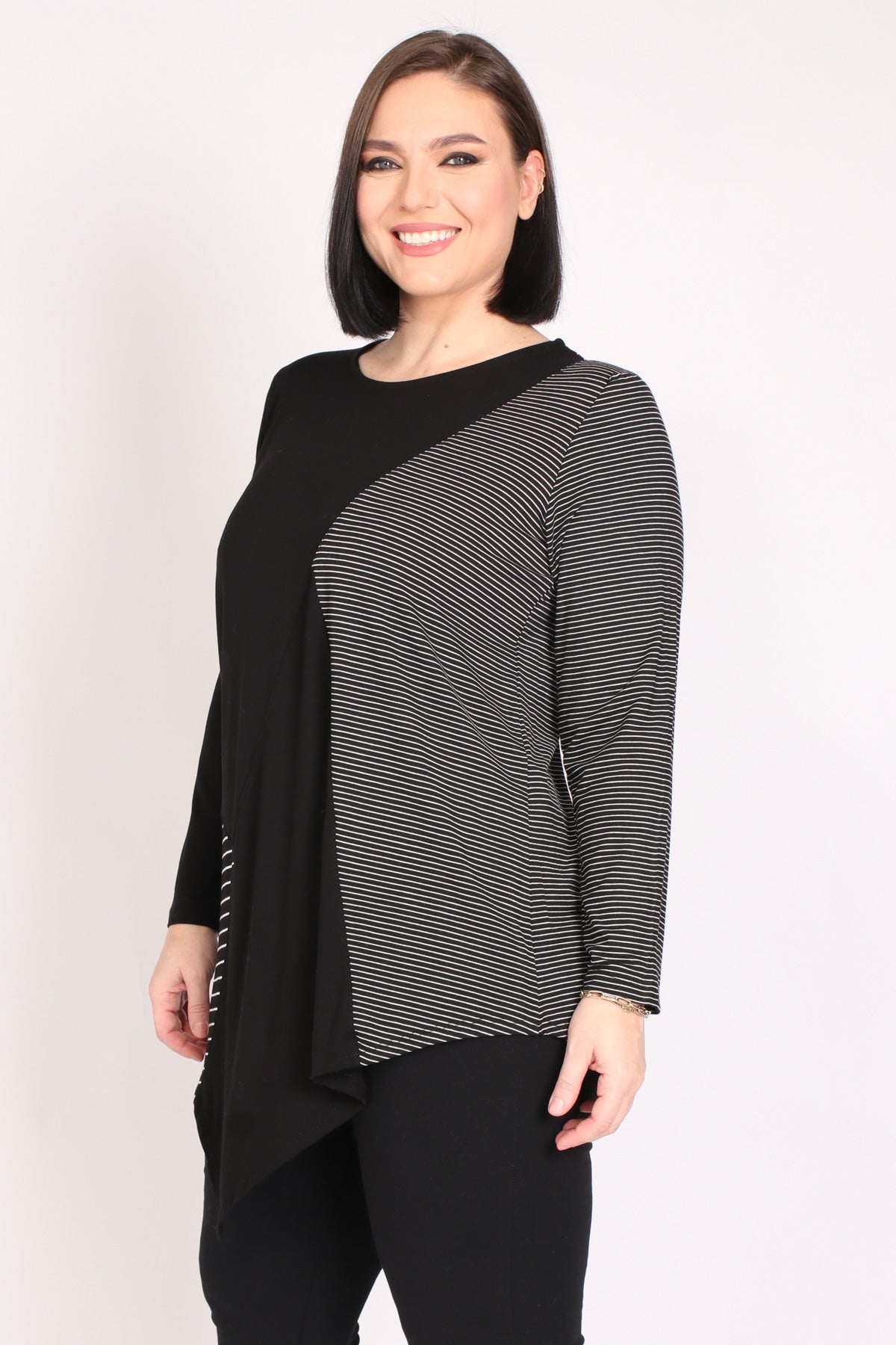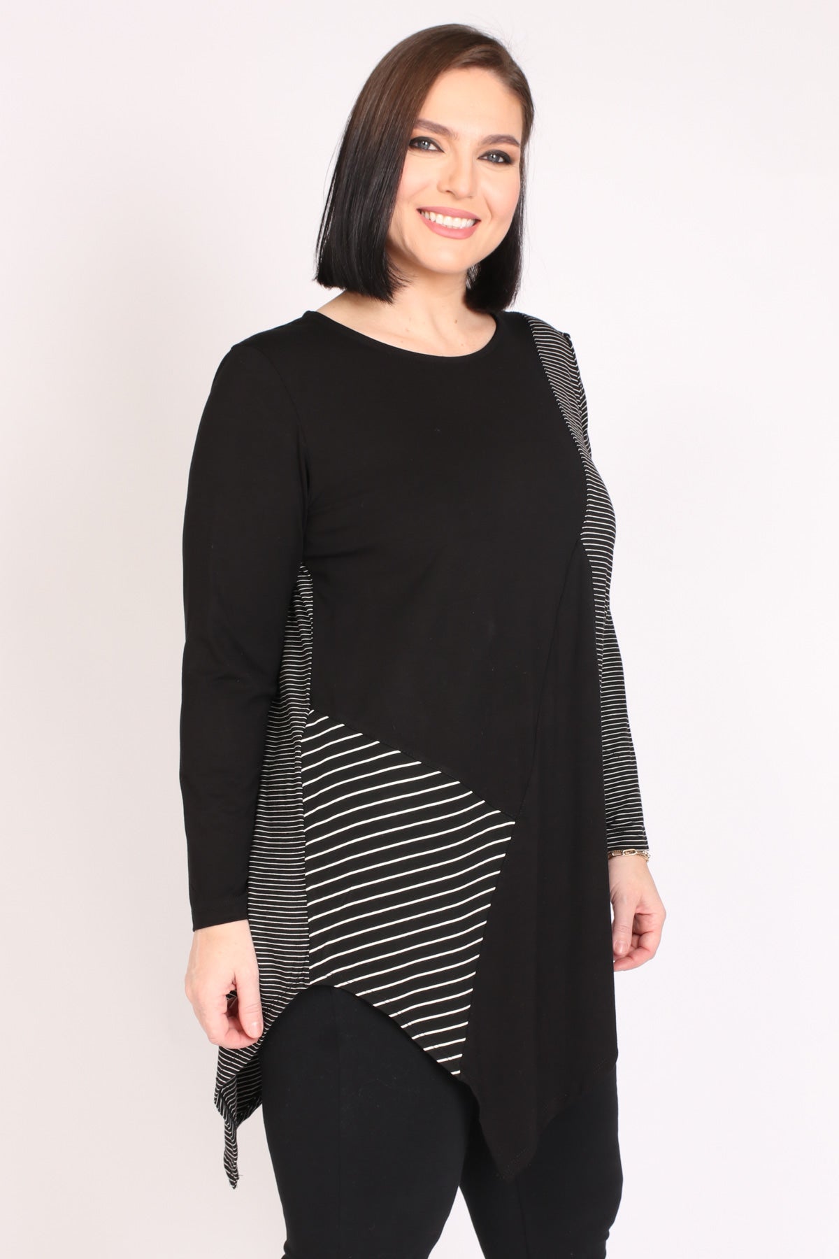 - טוניקה בסיומת שפיץ משולבת בד פסים דקים ובד חלק בשילוב מחמיא