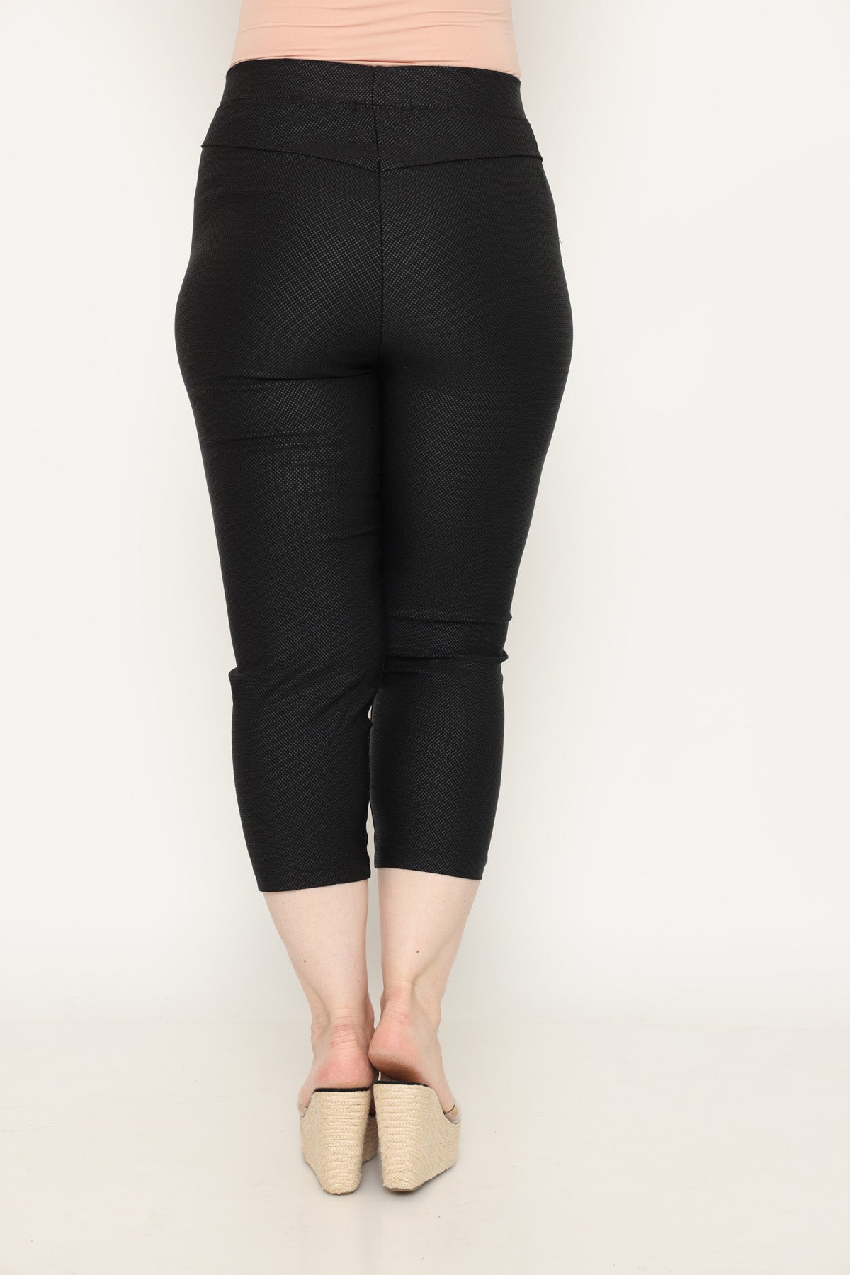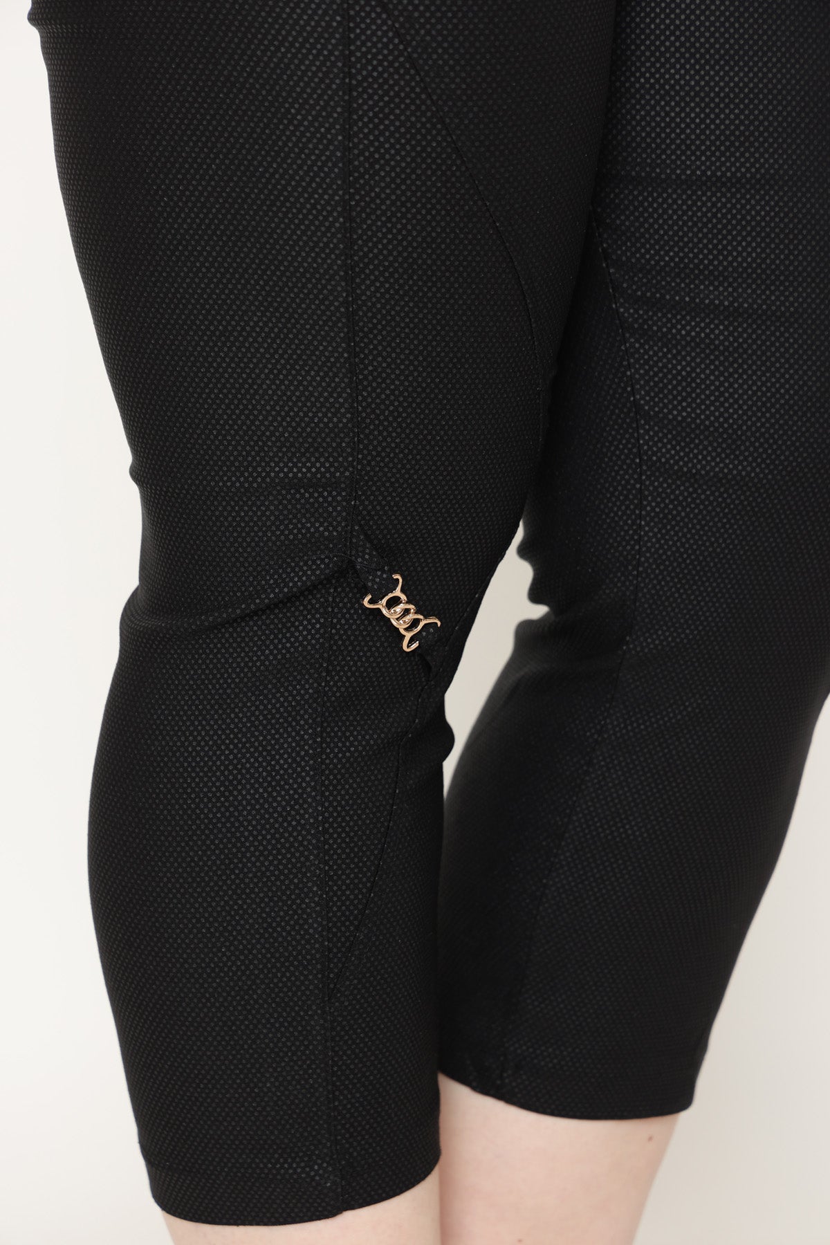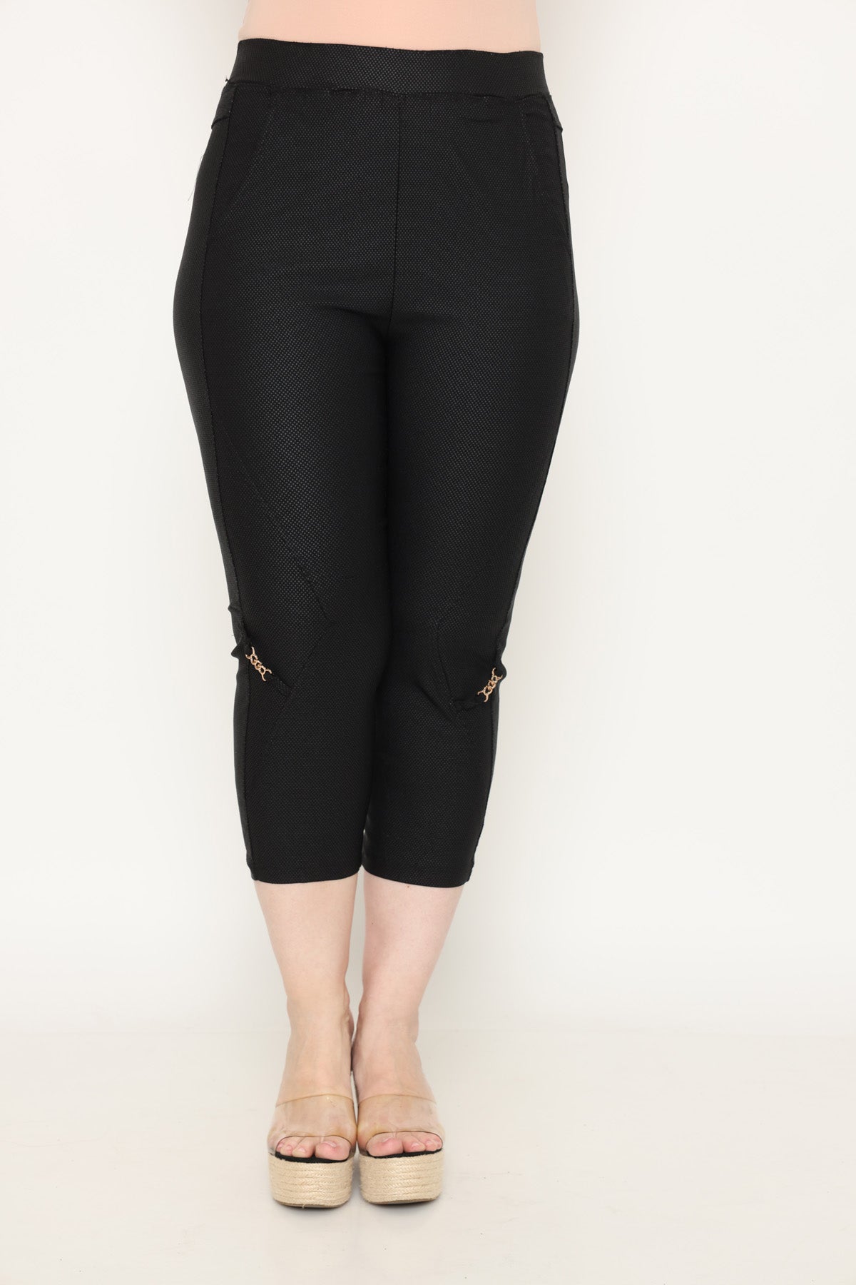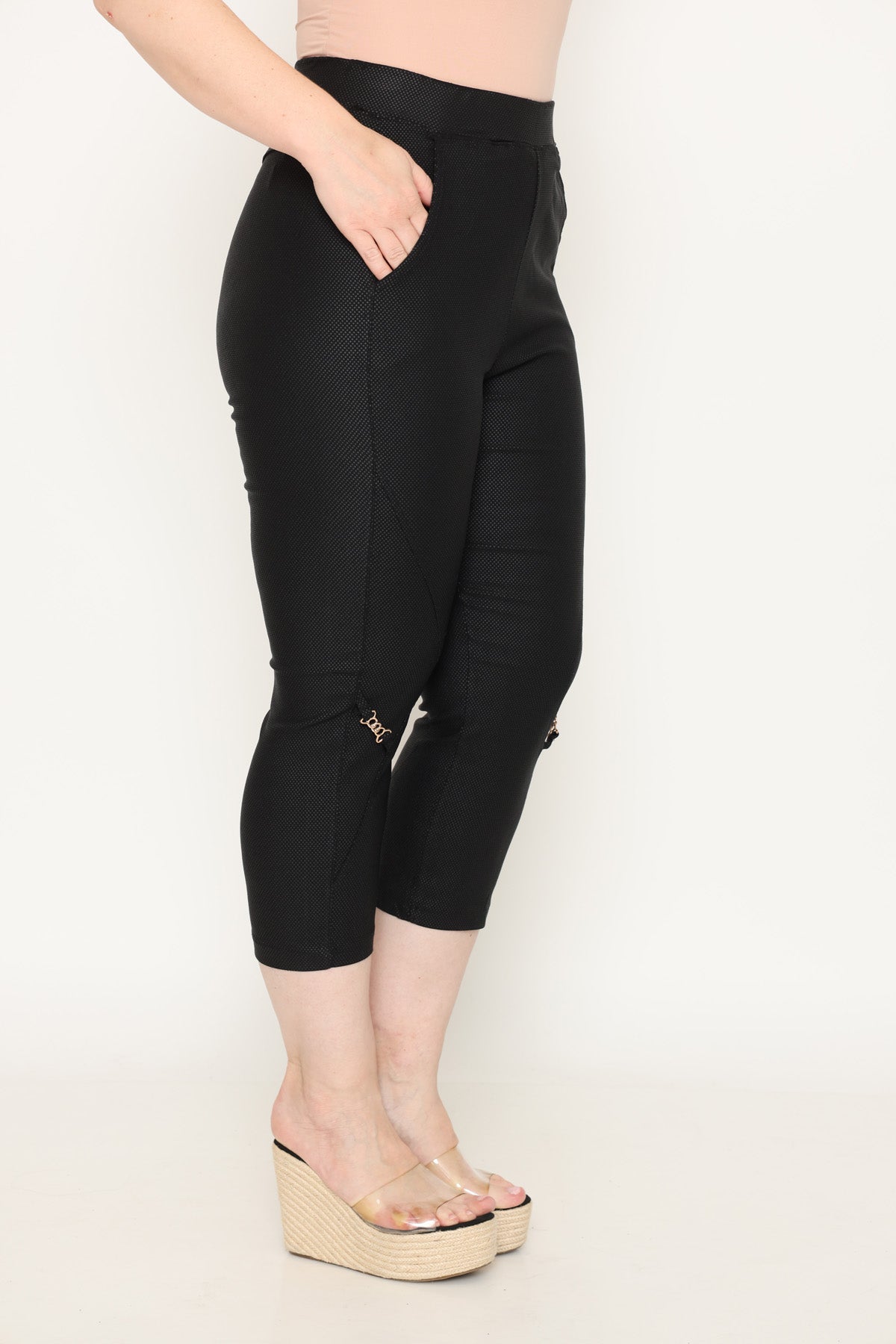 - מכנס עם גומי במותן וכיסים בגזרת סקיני באורך 7/8, מבד גמיש ומחטב.