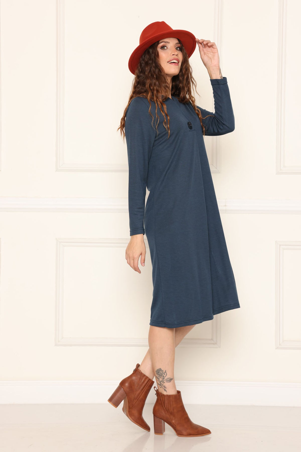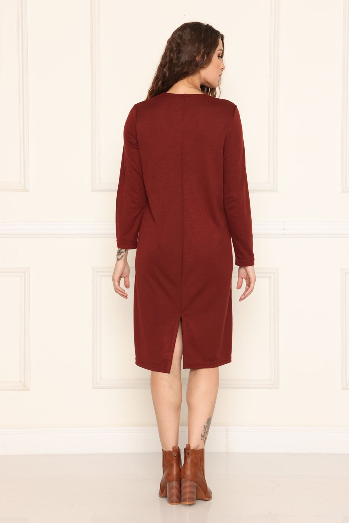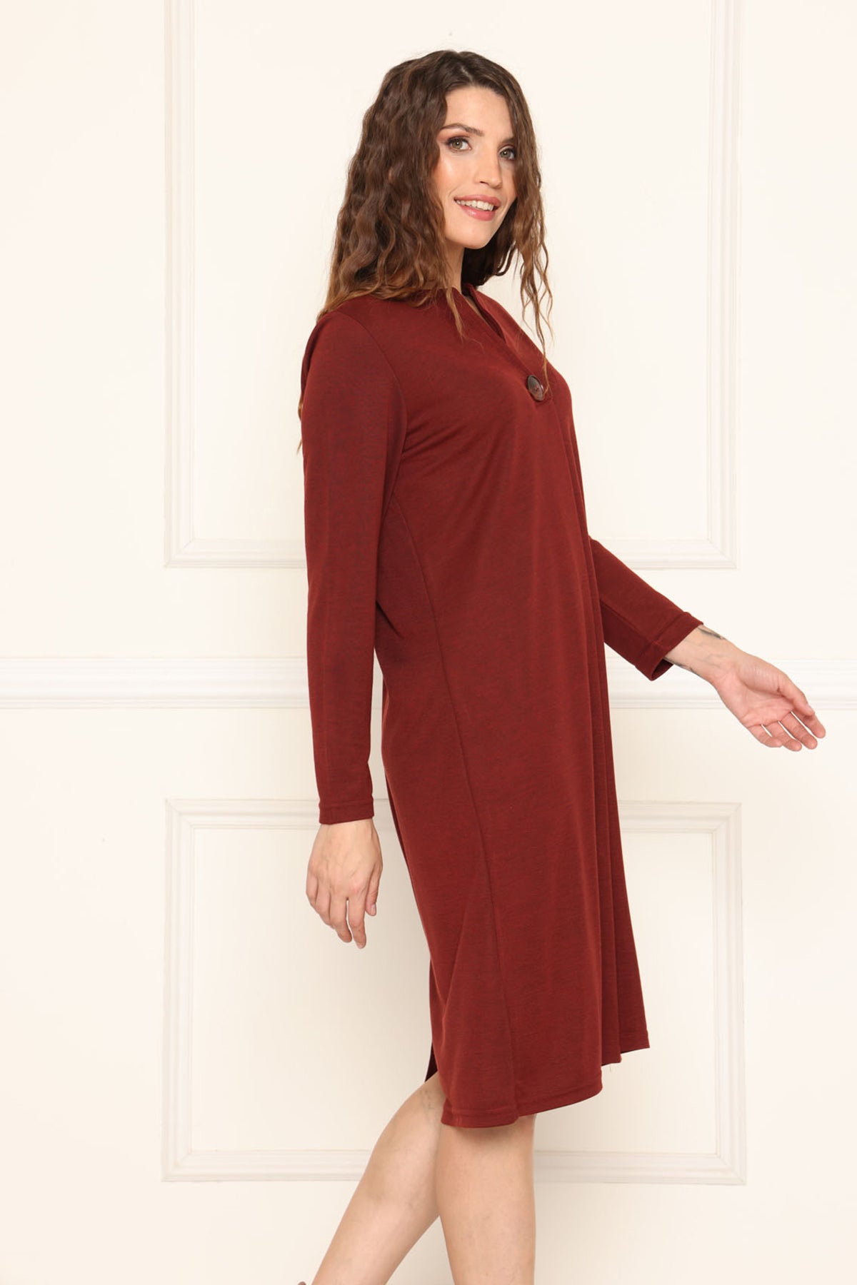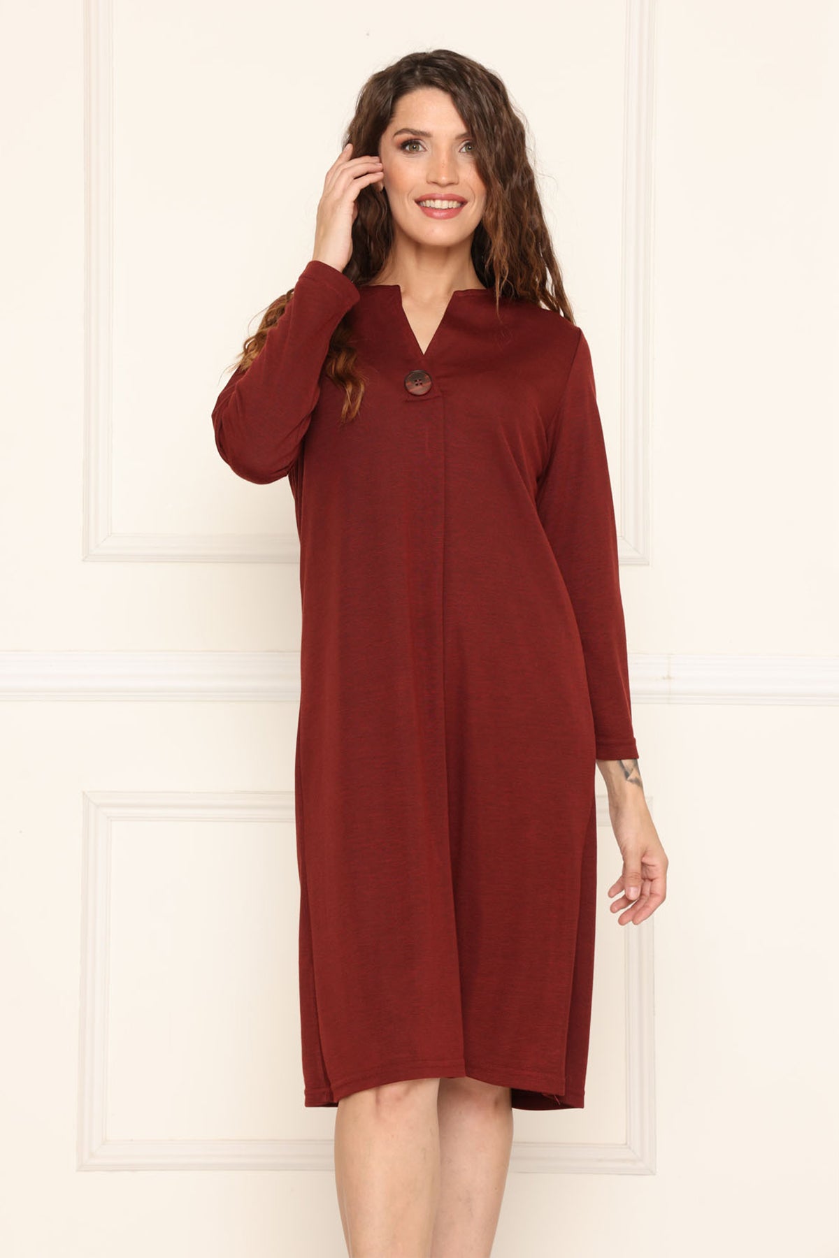 - שמלת באורך הברך בגזרה ישרה מתרחבת קלות, מבד סריג במראה מלאג’ עדין