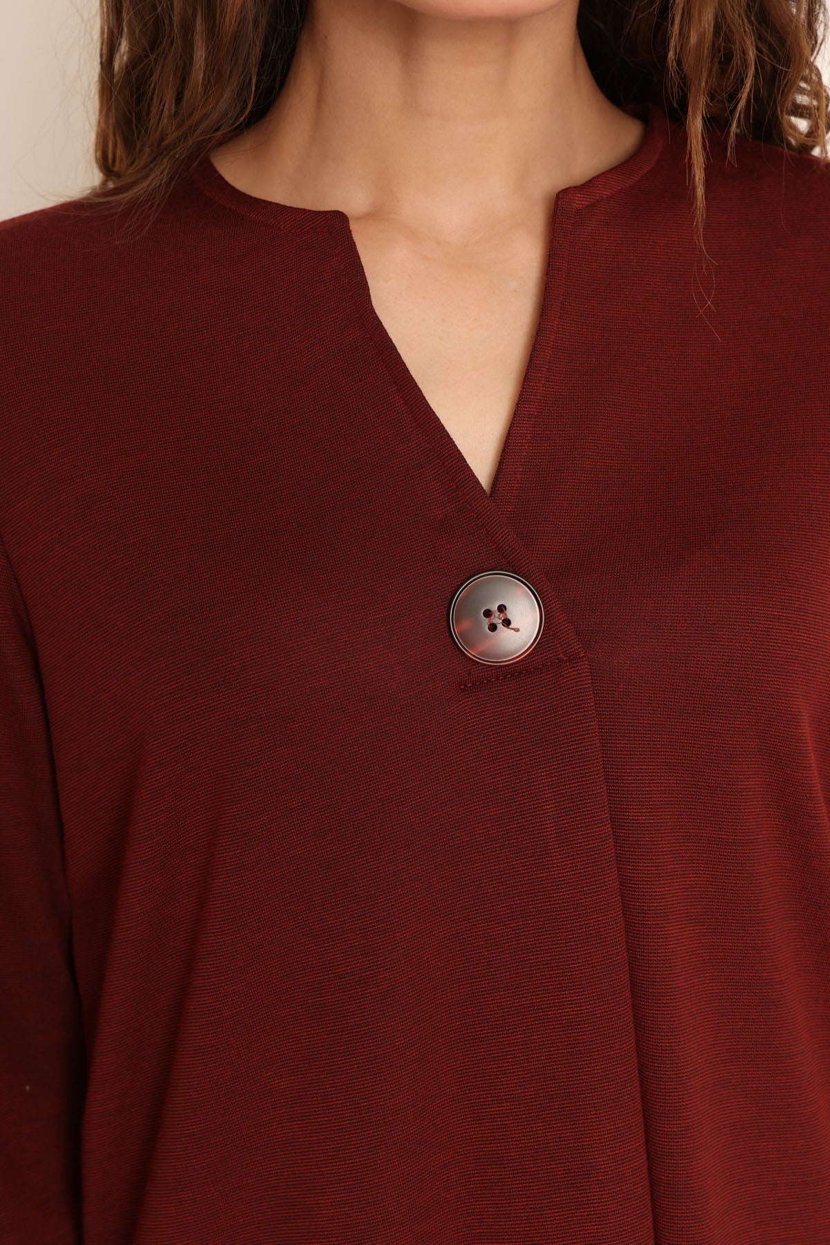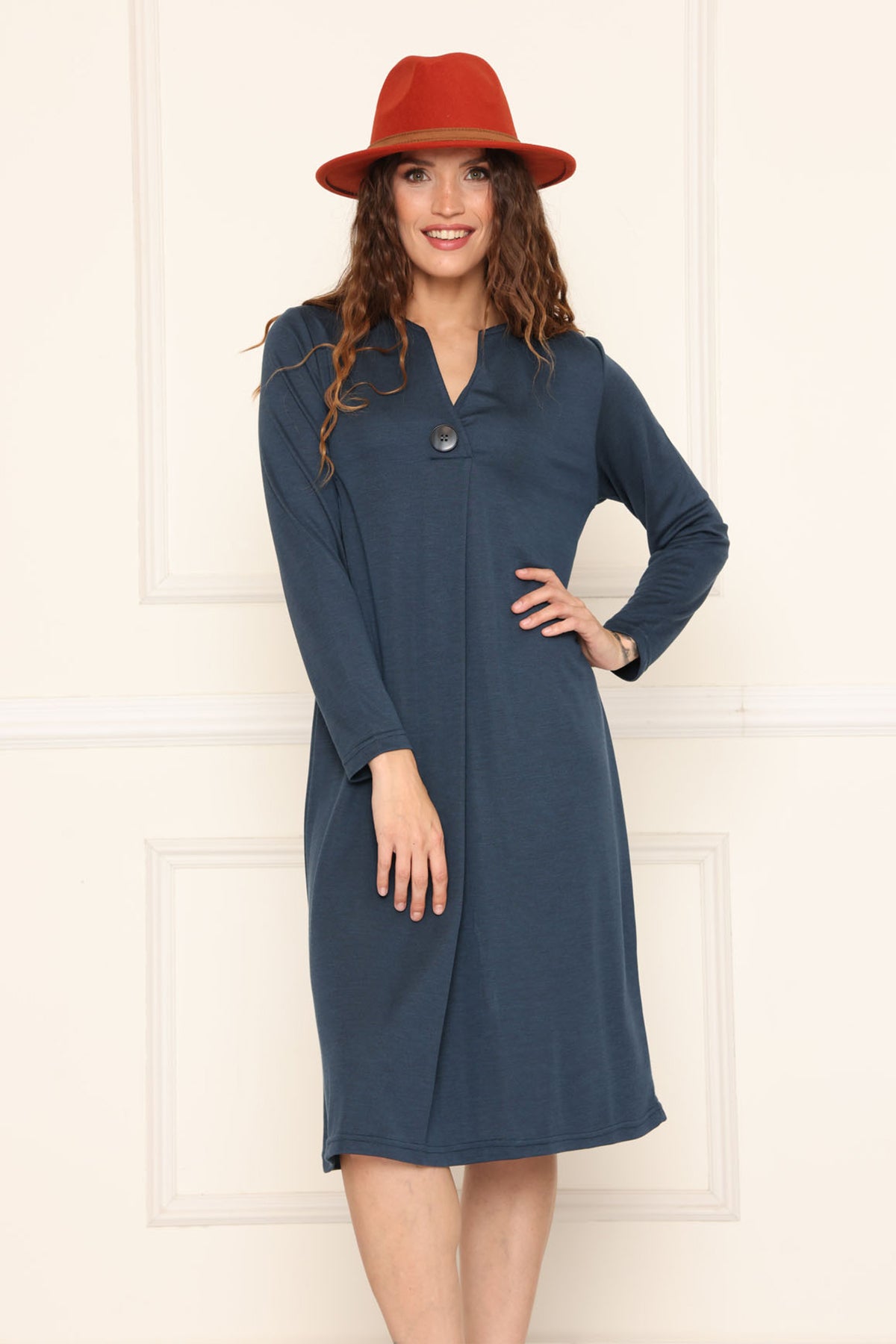 - לשמלה צווארון מפתח צוואר וי עם סיומת כפתור וקפל עדין ושרוולים ארוכים ושסע קל מאחור