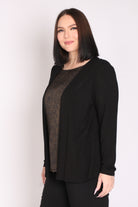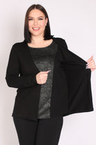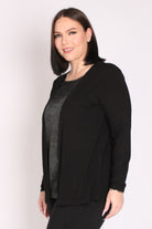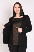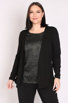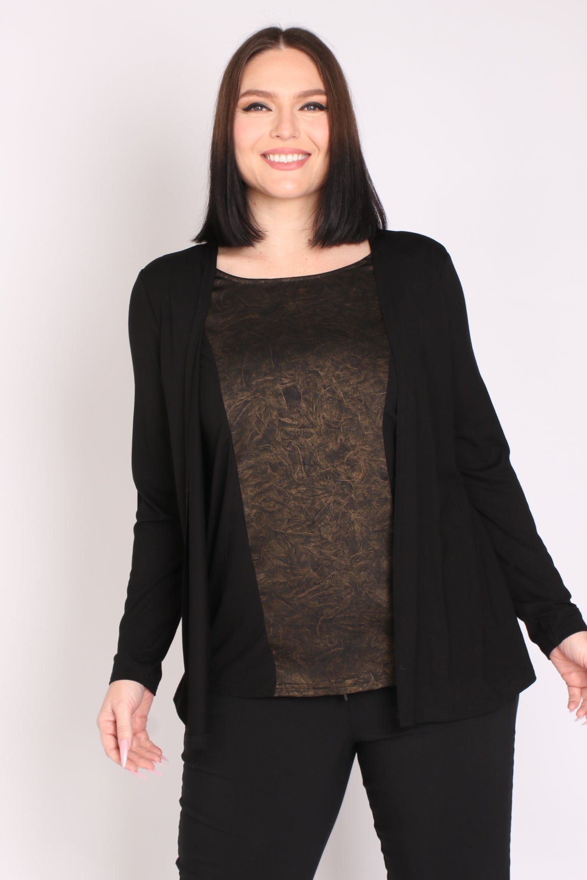 - חולצה מבד מודפס במראה מבריק, המחוברת לעליונית.