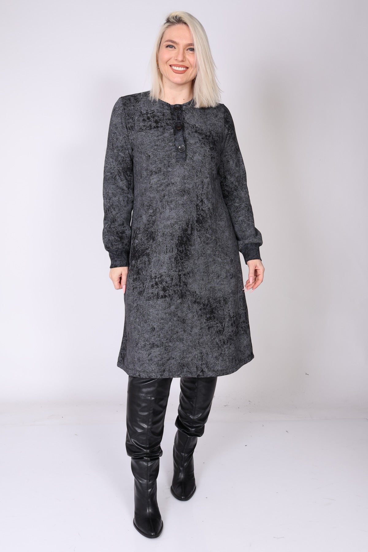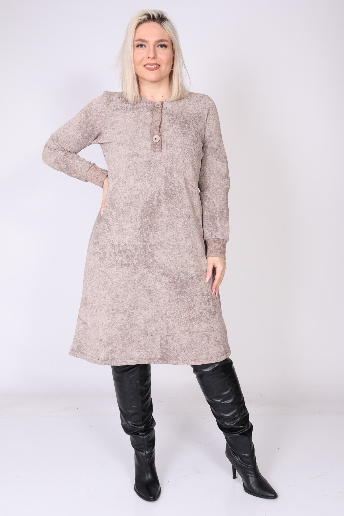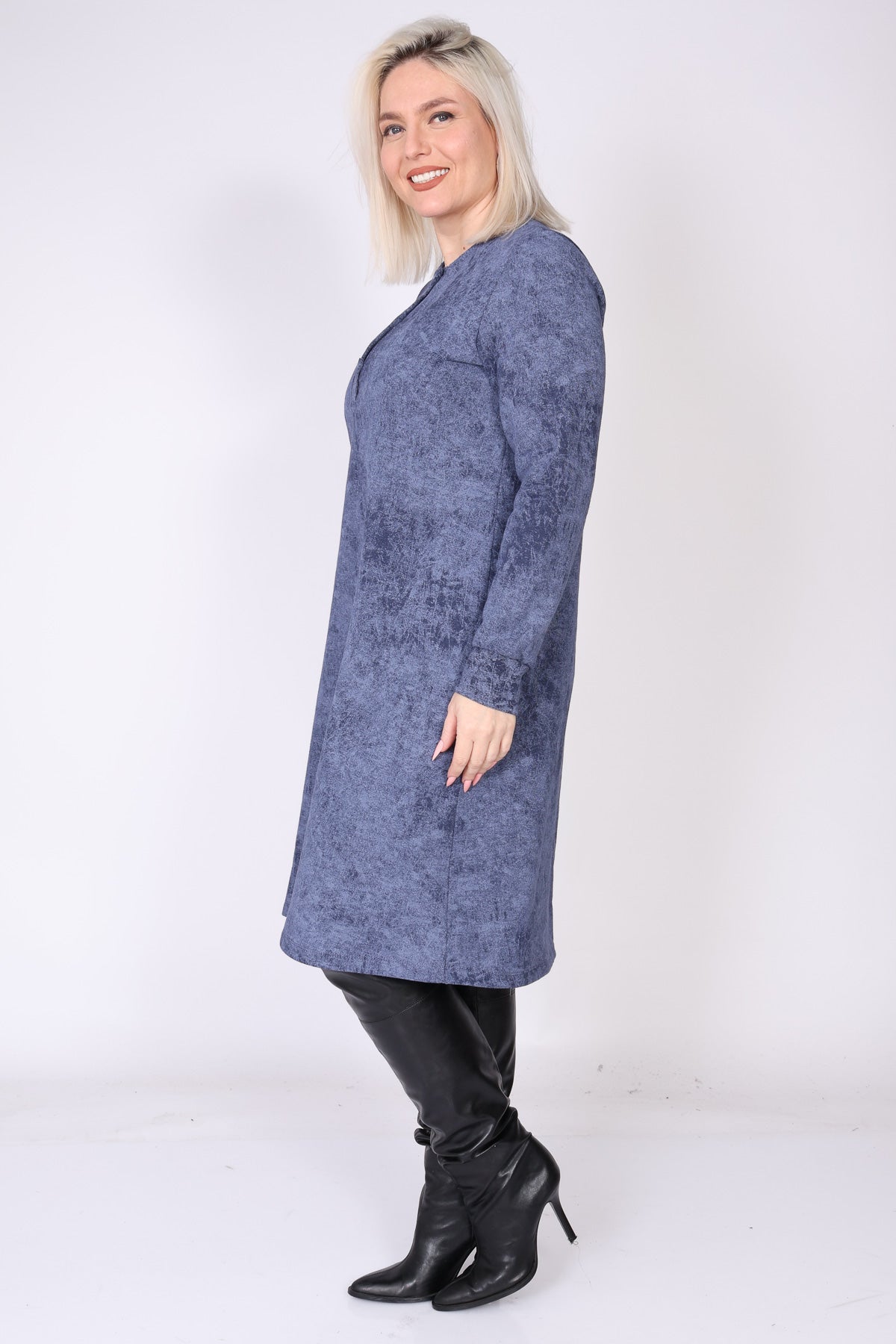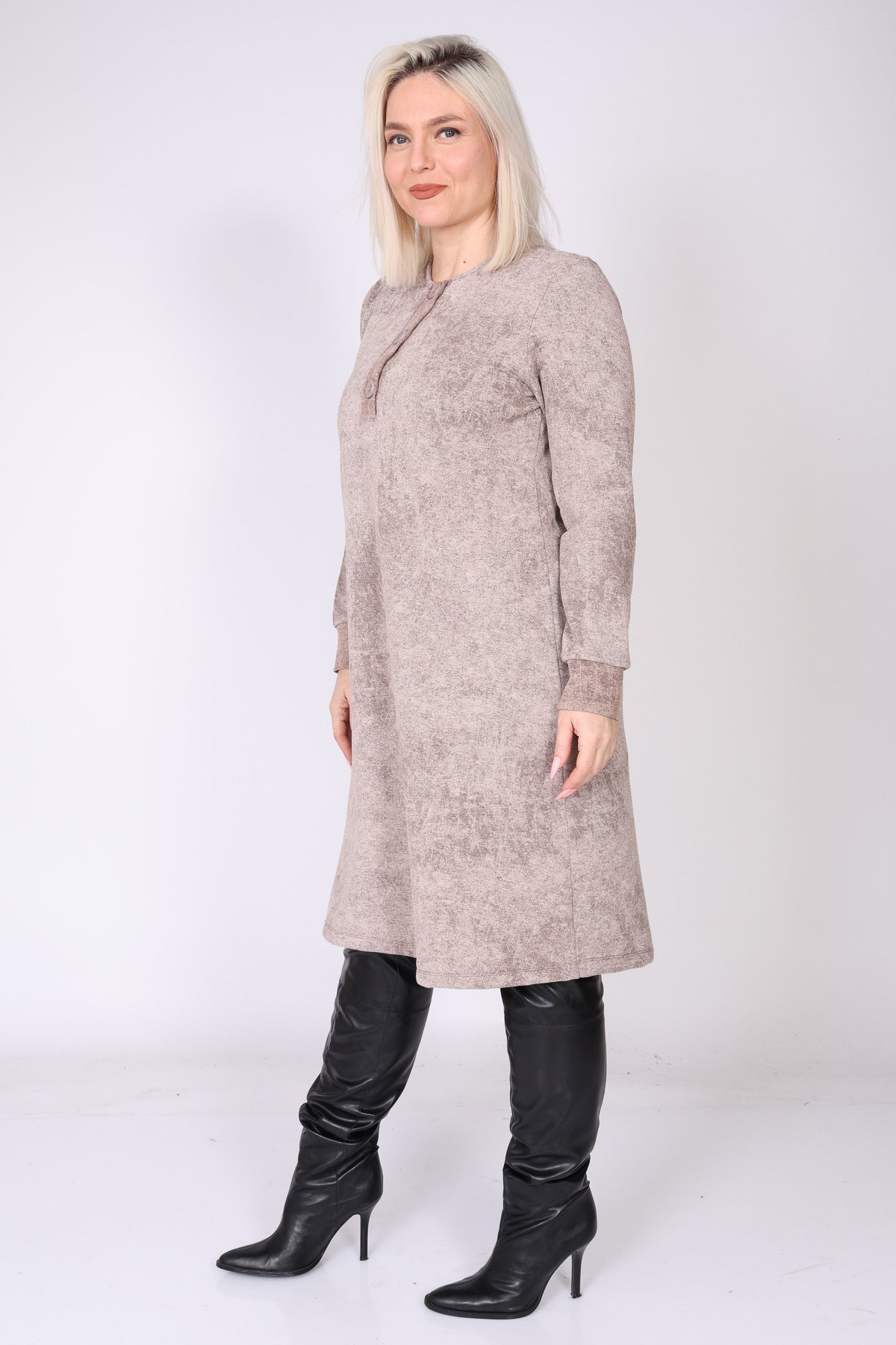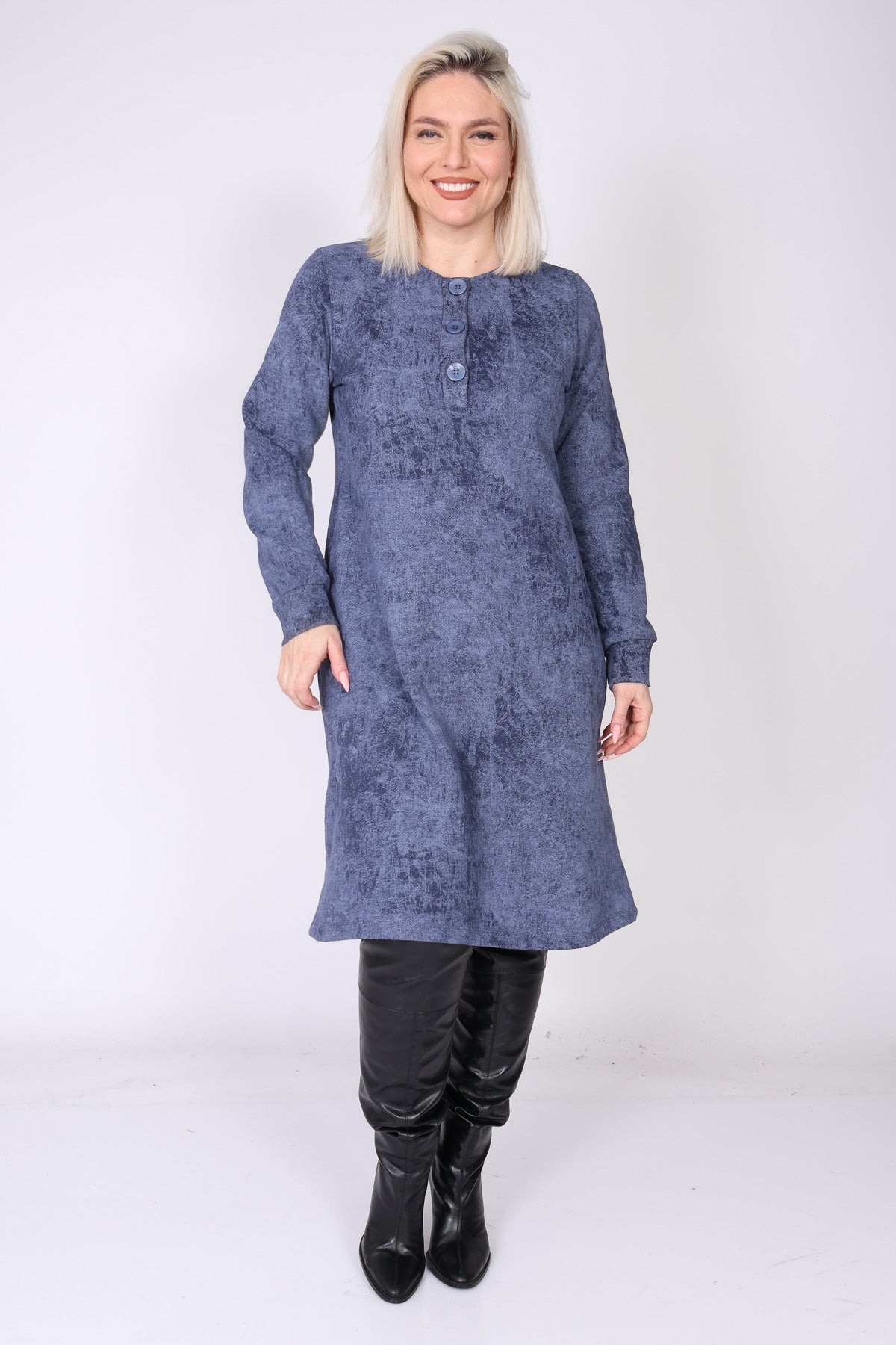 שמלת פוטר מבד בדפוס טאי-דאי רך, בגזרה שמתרחבת קלות ומעניקה מראה זורם ונינוח. שרוולים ארוכים ומפתח צוואר עגול עם סגירת כפתורים שמוסיפה נופך קלאסי ועדין, לשמלה שמרגישה נוחה וקלילה בכל יום.