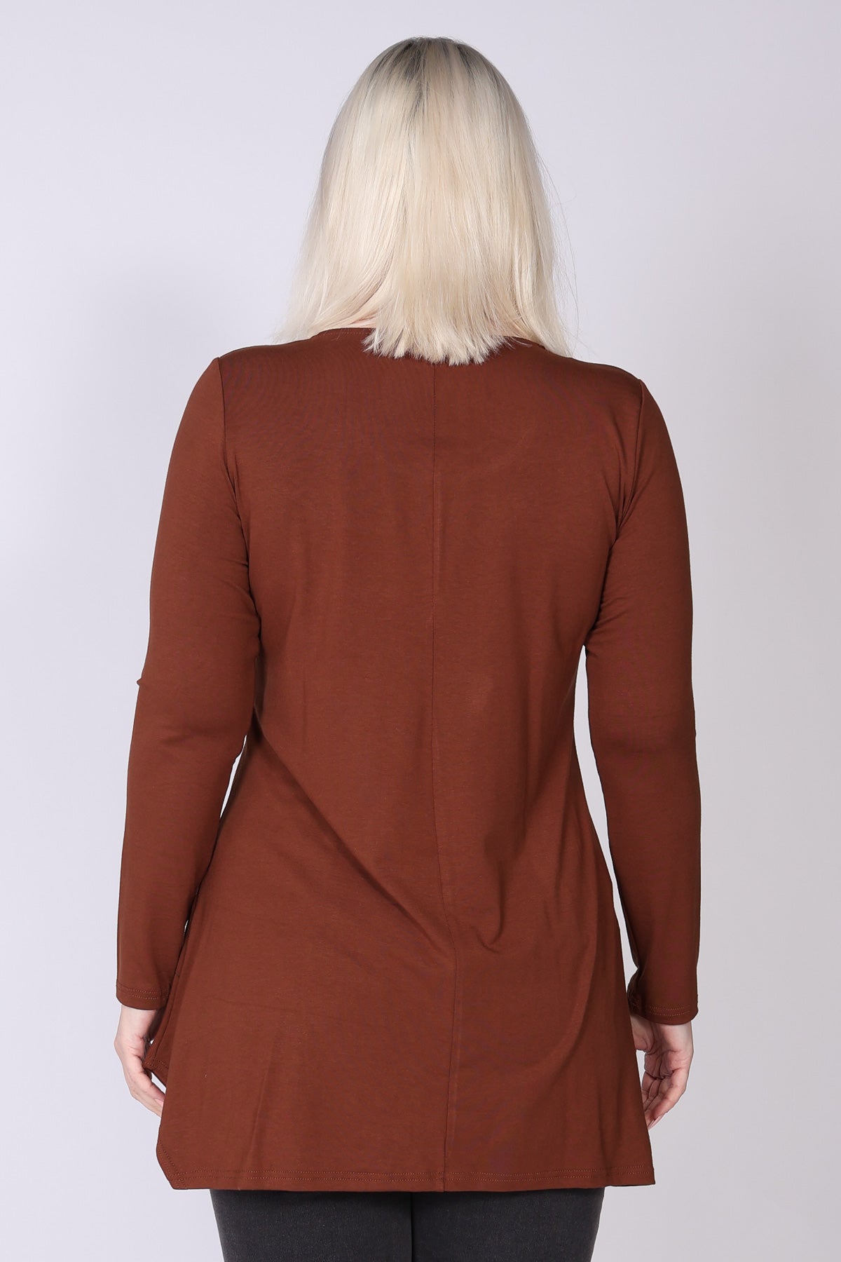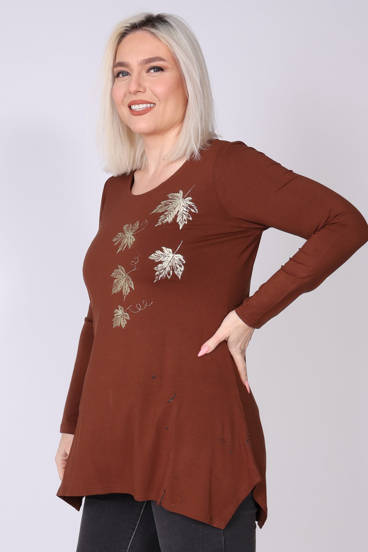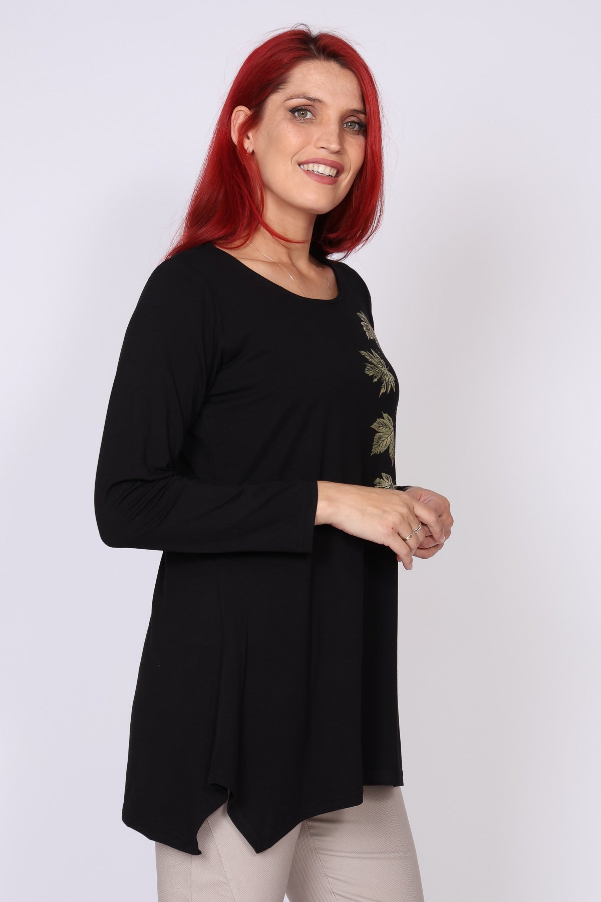טוניקה בגזרה מתרחבת קלות עם סיומת א-סימטרית שמוסיפה תנועה ונשיפה עדינה למראה. דפוס עלים מטאלי בצד מעניק טאץ’ אלגנטי ועדכני. מפתח צוואר עגול ושרוולים ארוכים יוצרים מראה נינוח אך מוקפד, והבד העשוי ויסקוזה גמישה מעניק נוחות מלאה לאורך כל היום.