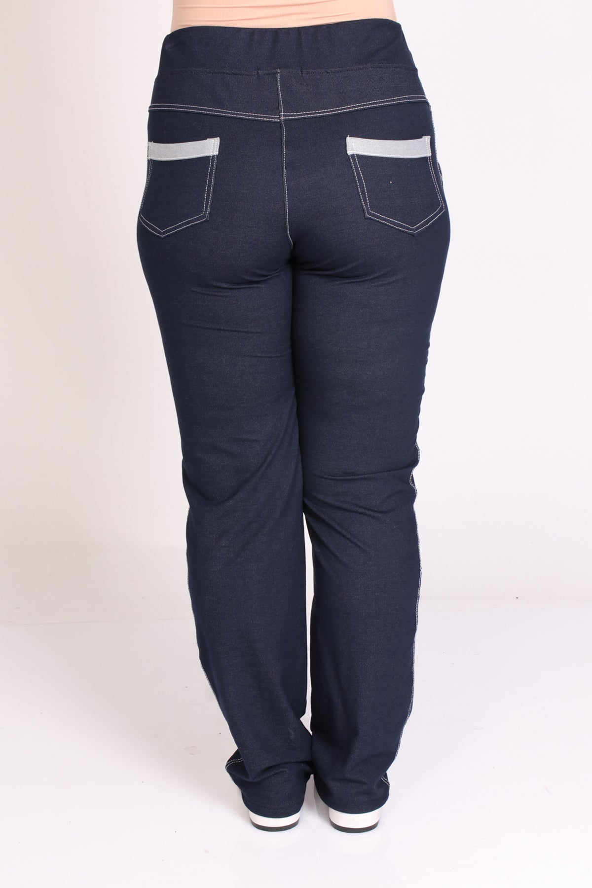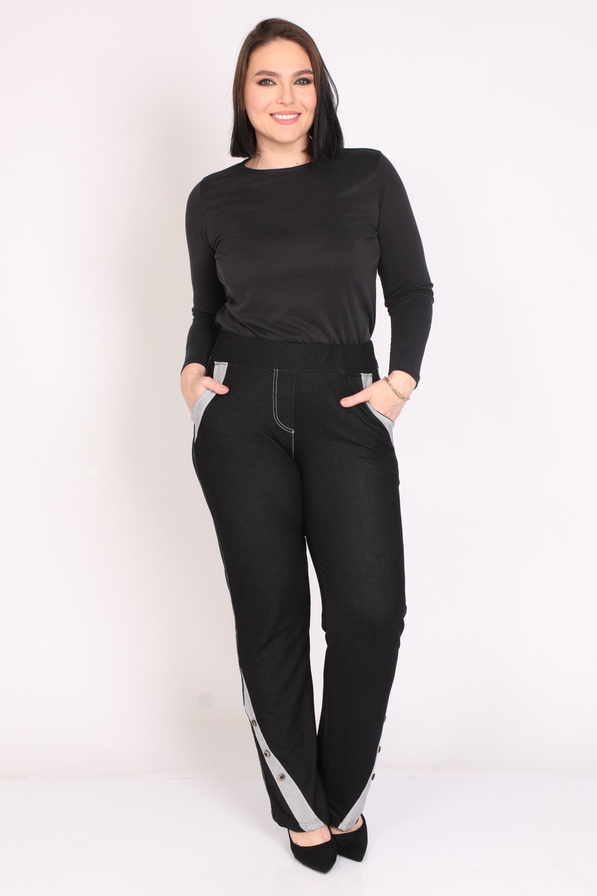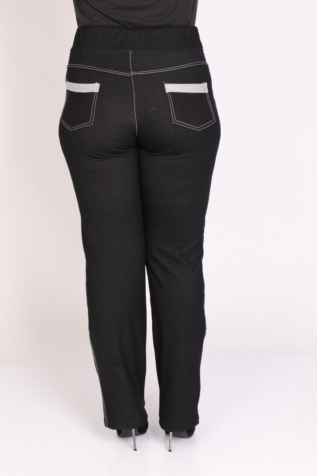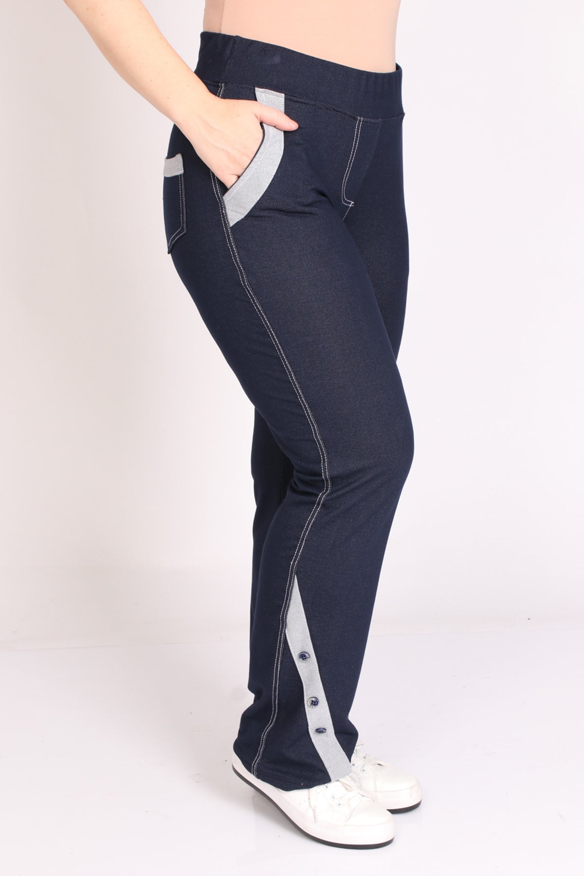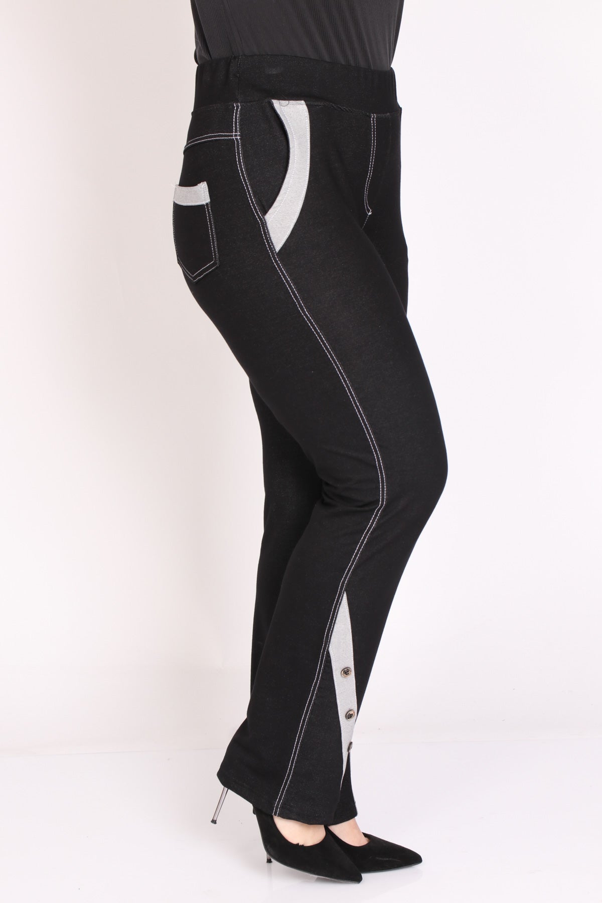 - מכנס דמוי ג'ינס עם עיבוד בכיסים ובחלק התחתון בעיטור שלושה כפתורים
